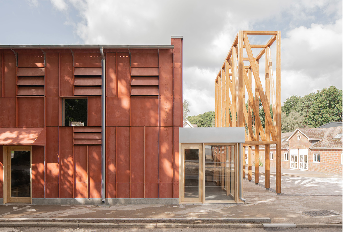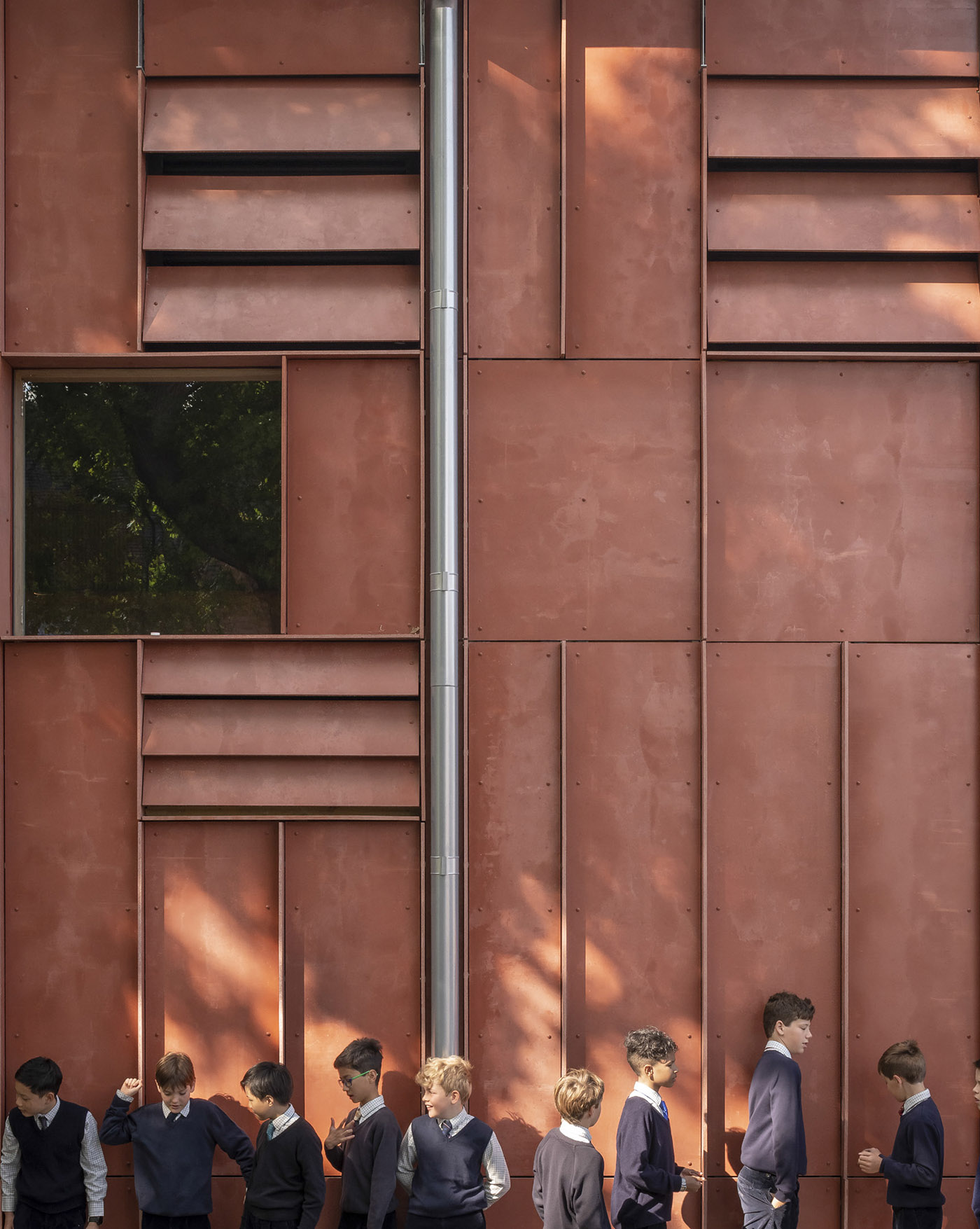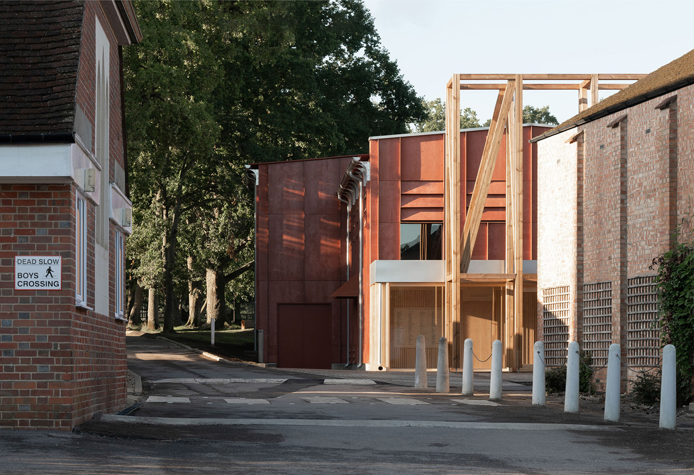 Earthy red Viroc elevations, mirroring the brickwork of existing Victorian buildings, characterize the auditorium dubbed the David Brownlow Theatre, by Jonathan Tuckey Design built to complement an existing historic complex. Materiality and structure are consciously distinguished: the building represents the school's contemporary sustainable ambition while respecting and acknowledging the past