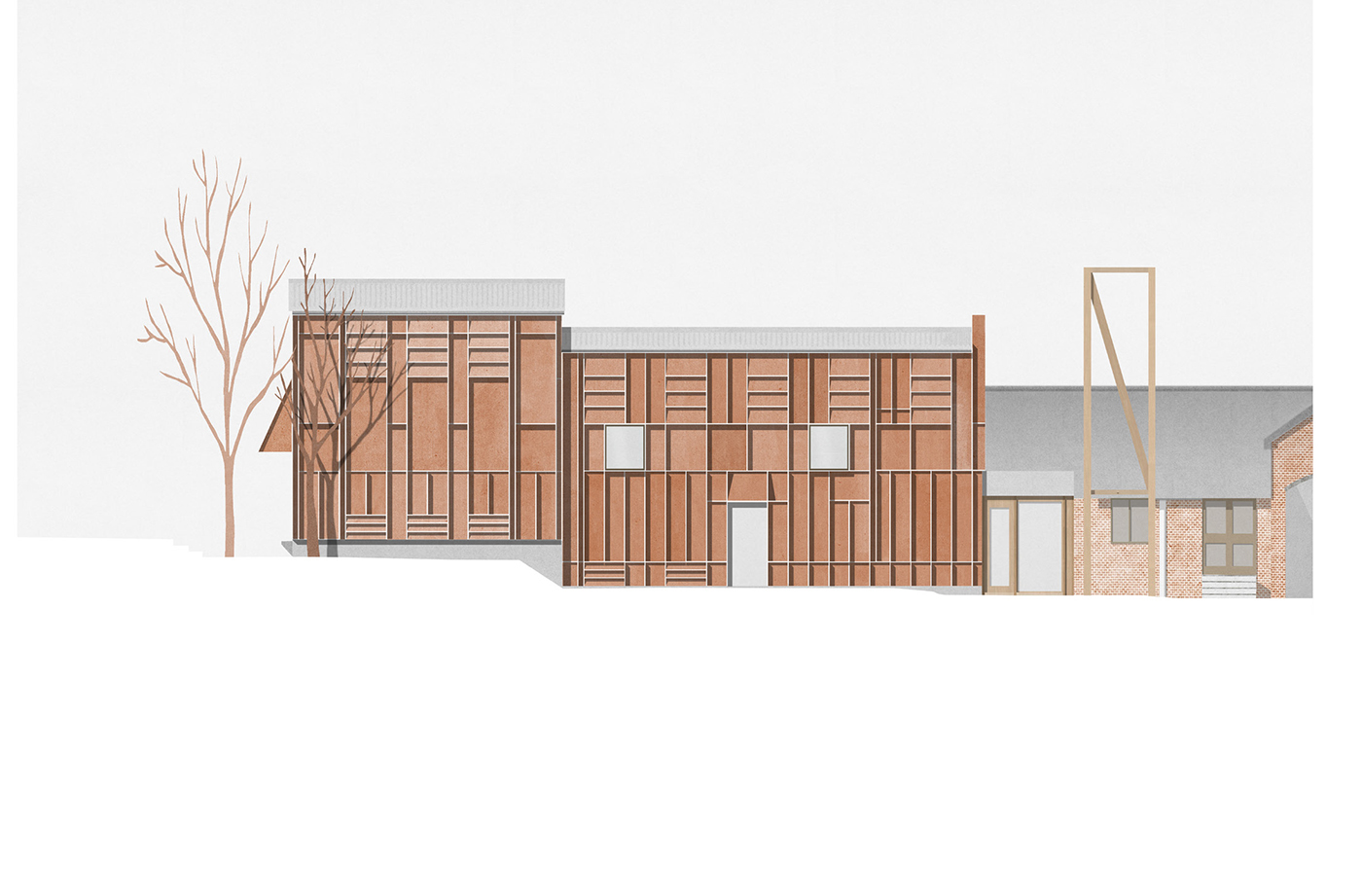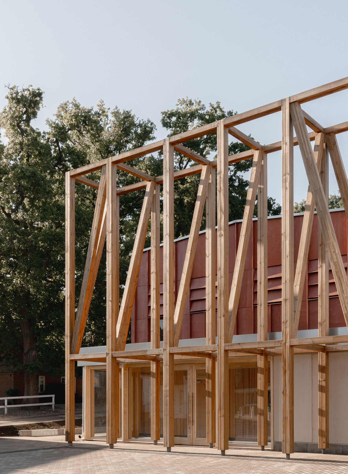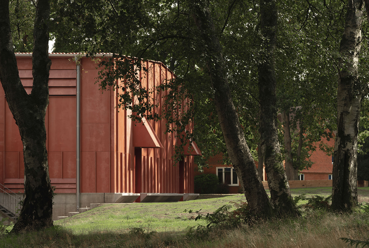 Earthy red Viroc elevations, mirroring the brickwork of existing Victorian buildings, characterize the auditorium dubbed the David Brownlow Theatre, by Jonathan Tuckey Design built to complement an existing historic complex. Materiality and structure are consciously distinguished: the building represents the school's contemporary sustainable ambition while respecting and acknowledging the past