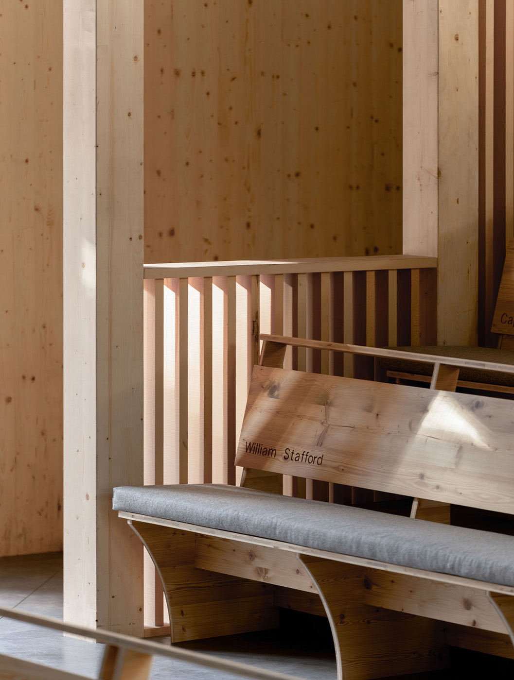 The Viroc was machine-cut off-site to reduce waste and assembled by hand as a single joinery item. The design is innovative in its assembly. The interior is minimal and efficient: the dark blue undulating ceiling echoing the night sky and the black Glossy din Viros floor. The cross-laminated timber structure is chosen for its economy and to reduce construction time on site
