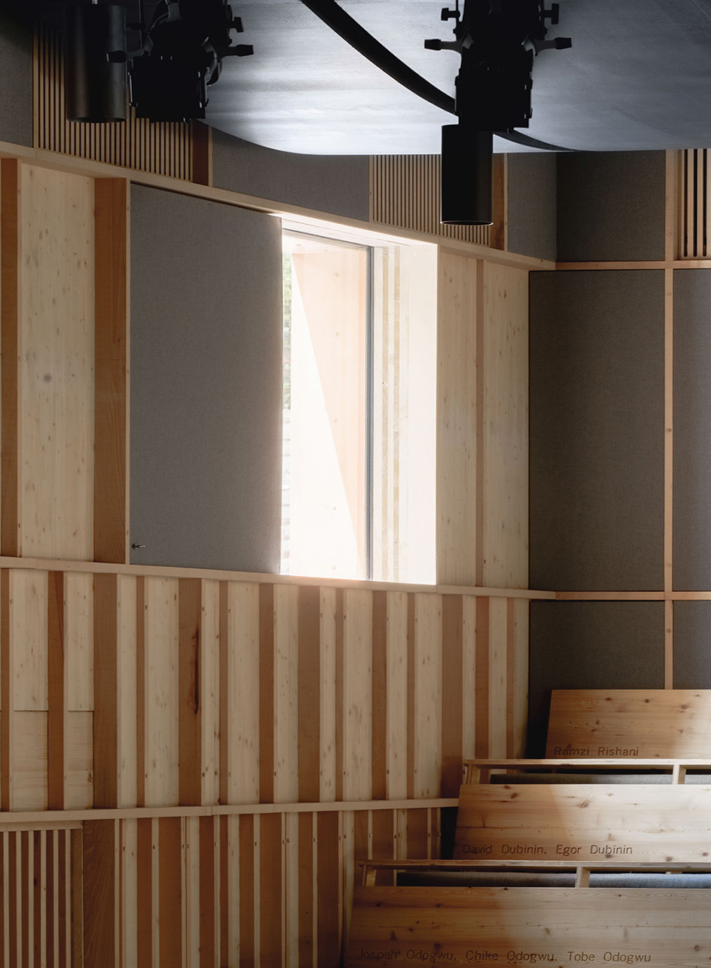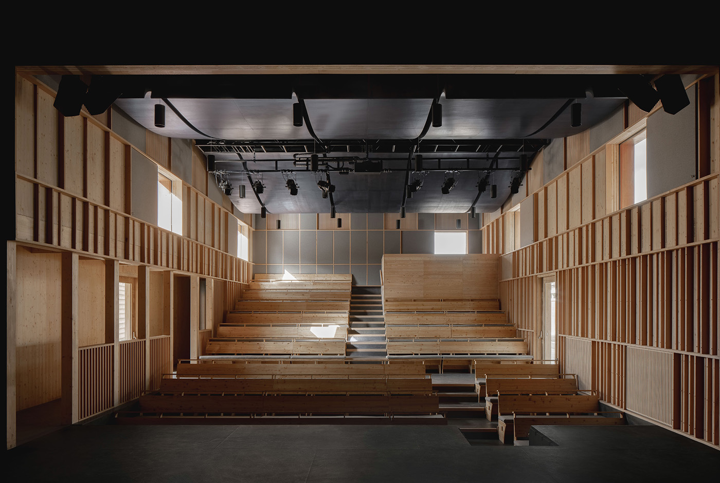 The 160-seat auditorium, designed at Horris Hill School in southeast England, complements the school's existing campus-a sustainable building rich in historical references