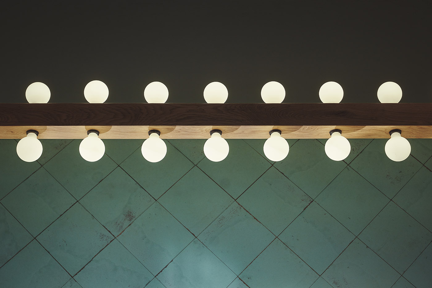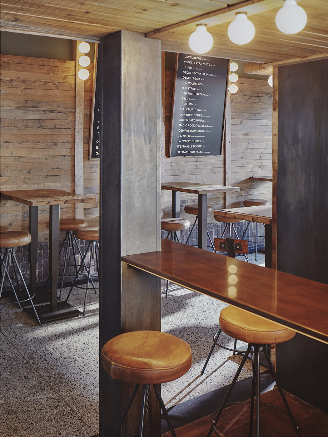 The walls are covered with a soft touch of recycled oak to allow the texture of the custom furniture to stand out and to highlight the dark grey concrete of the bar. Warm, dark tones on the ceilings and upper plinths form a backdrop for the rows of light bulbs connecting the two areas