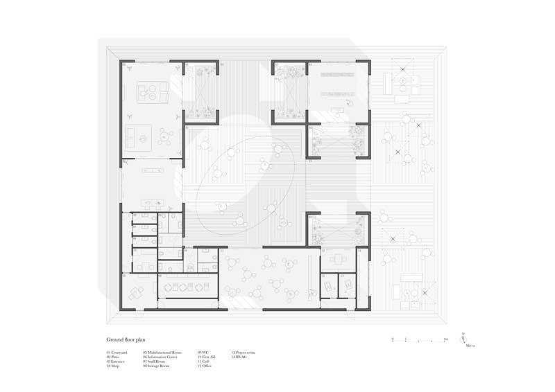 Shortly after their visit, they were asked to design a Visitor Centre, just months before the exhibition's opening. The challenge was to design quickly, working with local suppliers and limited materials. The brief was simple: a welcoming point with a café, information center, and services. The design had to be discreet, functional, and in harmony with the surrounding environment, without overshadowing the artworks.