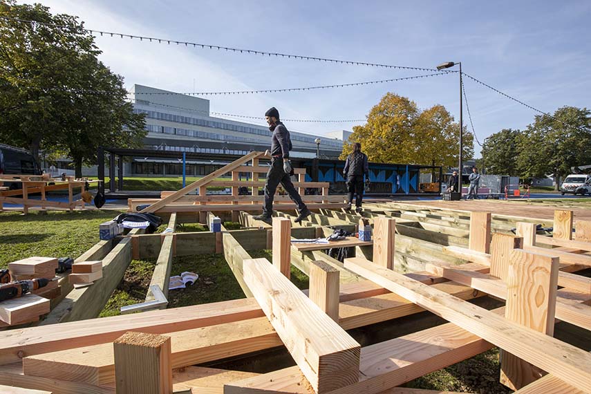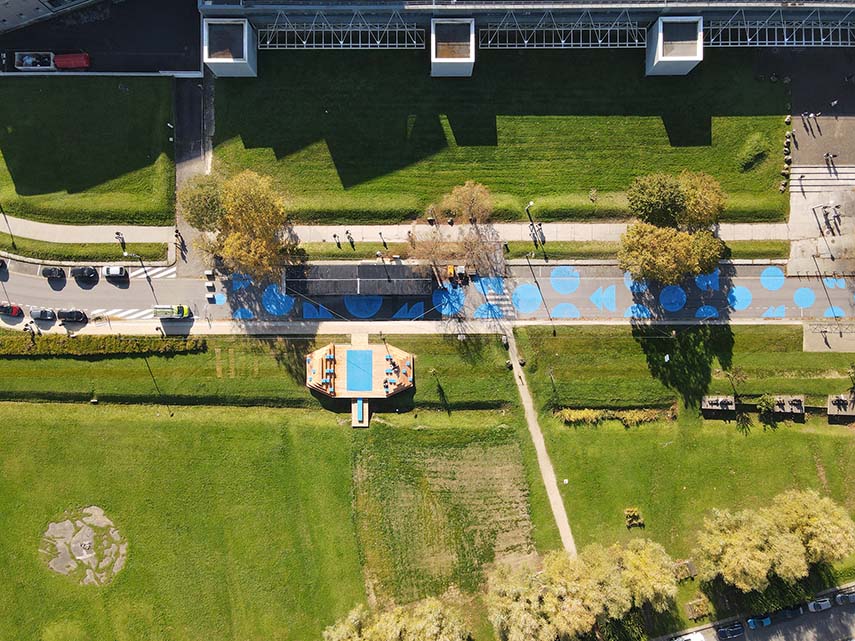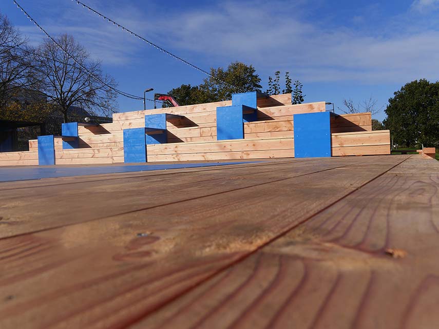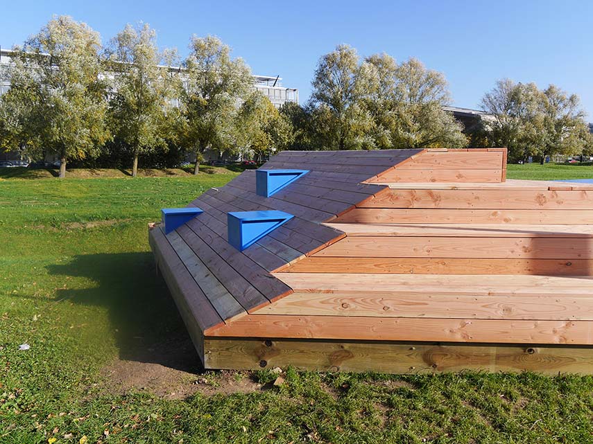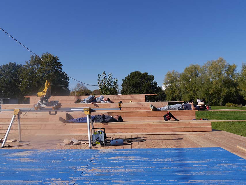 La PiscYne is a participatory design project by the studio Bruit du frigo, created for an urban space. The project was open to volunteer students for 13 days, who joined the architects in developing the design concept. This wooden platform, inspired by the shape of a swimming pool, provides a unique space for events, relaxation, and socialization, showcasing the power of art and architecture in redefining public spaces.