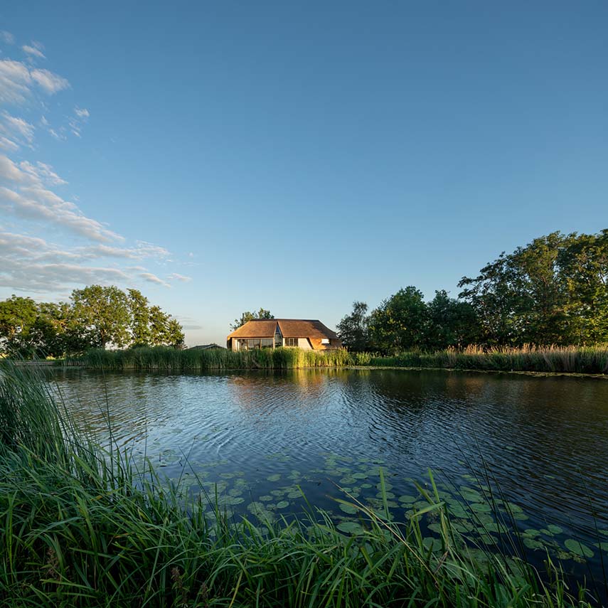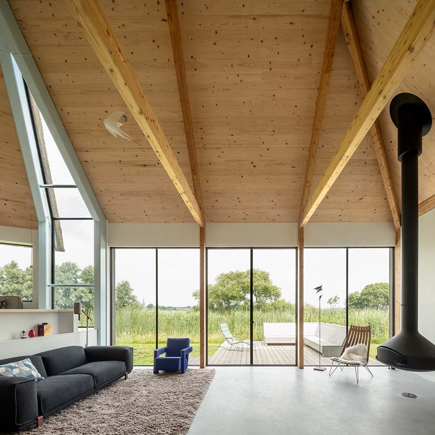 Mirck Architecture designing the new Dike House uses the splendid available views, natural light, and wood. Mirck proposes to open the living space to the north, breaking the volume of the house from the side opposite the dike, facing the polder landscape. The outer corner of the new fissure is completely glazed and brings a lot of natural light into the large open space, creating the sensation of being part of the landscape.