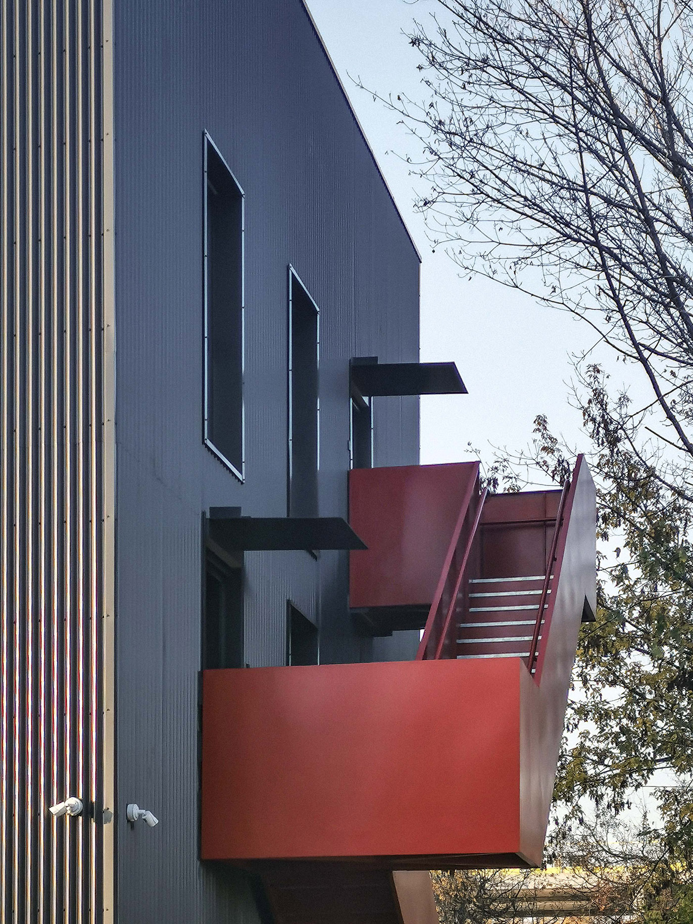 The building maintains in its new identity the original presence of the exterior steel staircase. Redevelopment is done on the building elements such as stairs, terraces, railings, entrance canopies, only where it is necessary to consider new layouts and connections