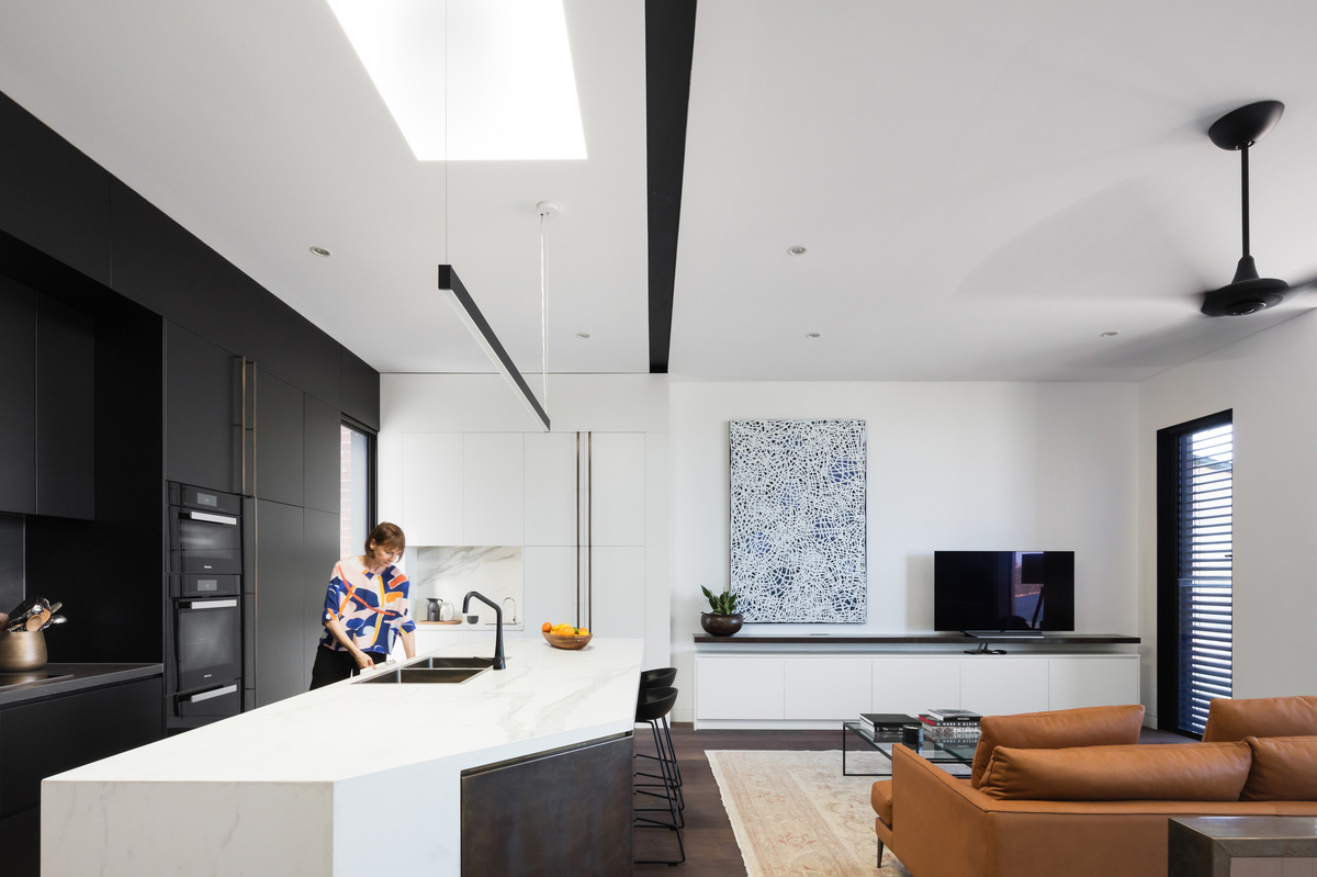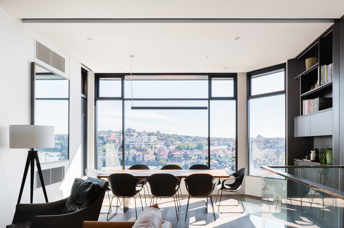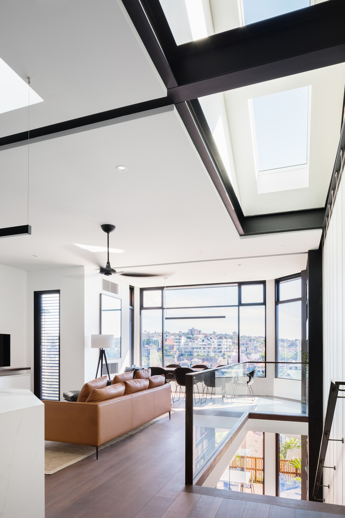 The dismantling of the existing floor in favour of the glass makes it possible to connect the two floors of the house, while the perimeter windows offer the occupants a view of Sydney Harbour