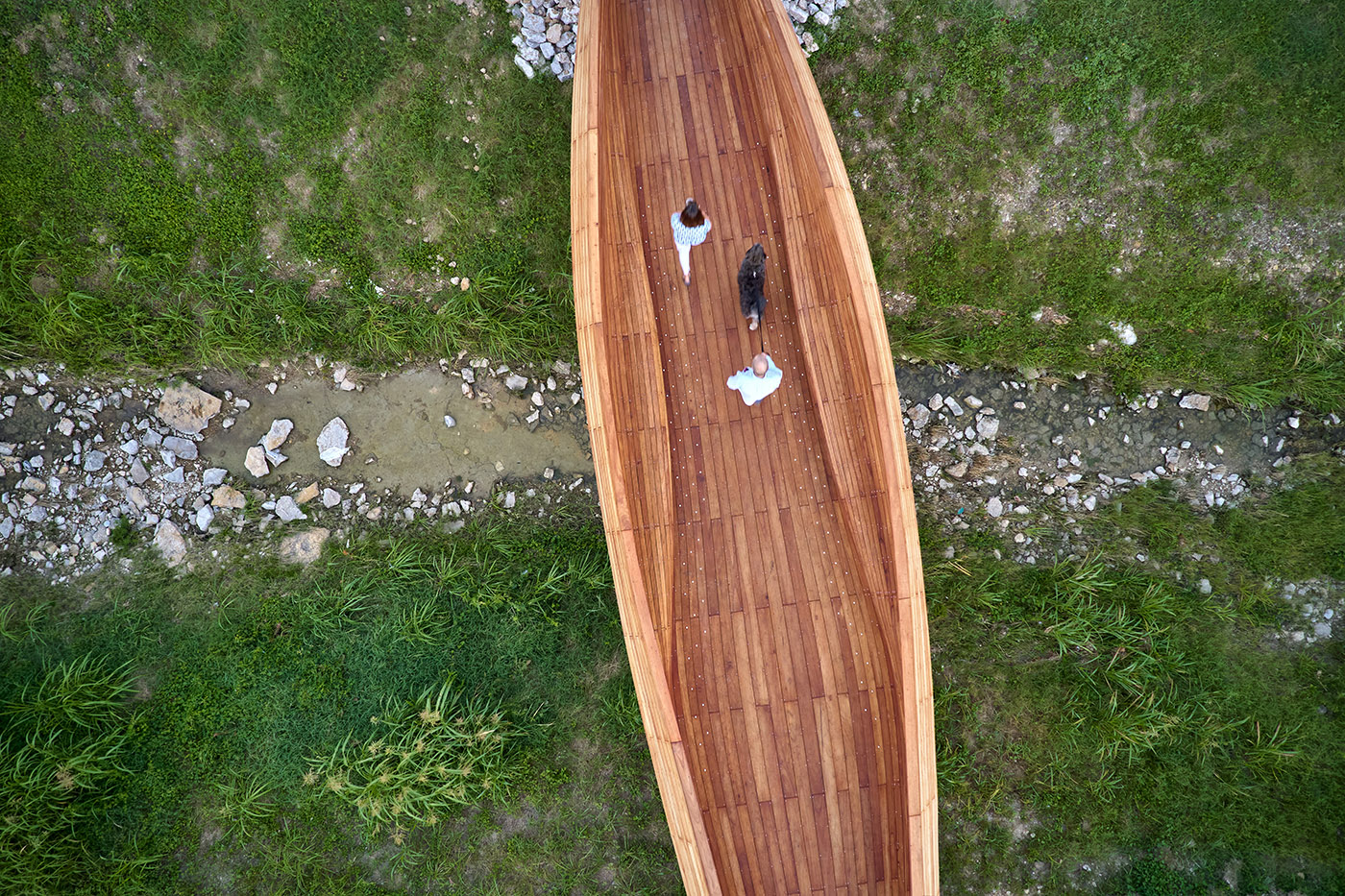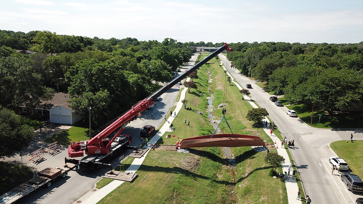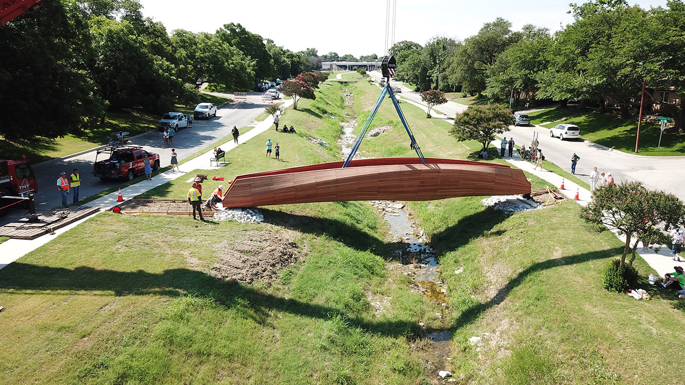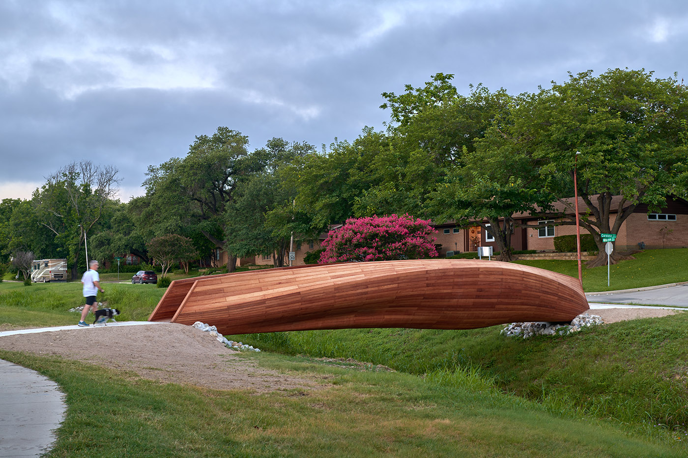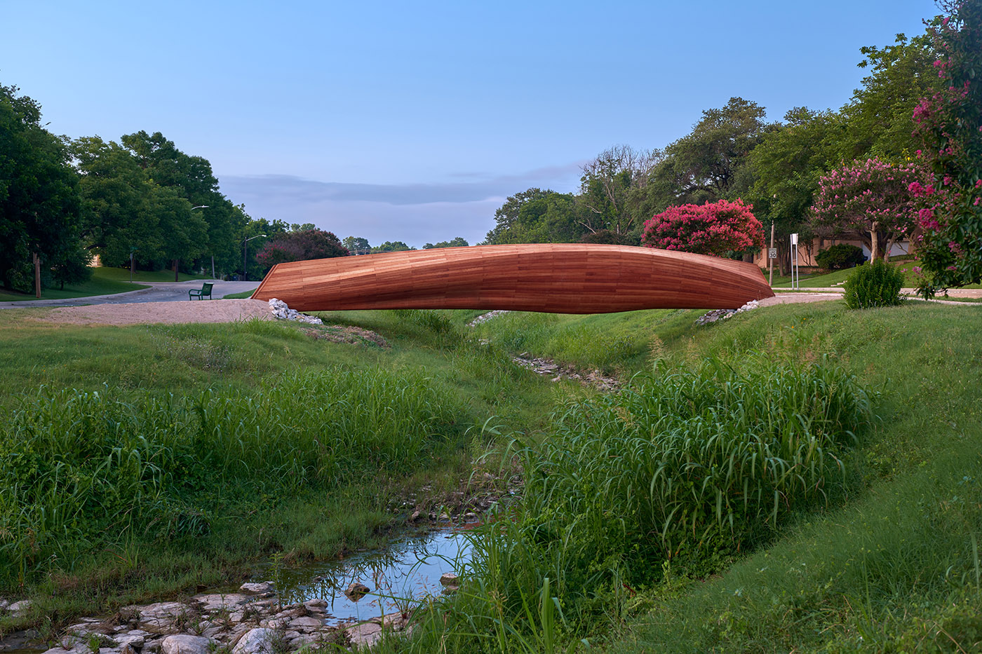 Architectural projects by Alkanoglu challenge conventions and creativity. They conceived Drift in response to a brief from Fort Worth Public Art to create a pedestrian bridge crossing a stream in a residential neighborhood of South Hills. The bridge's design focuses on three key principles: the use of sustainable materials to reduce environmental impact, cost reduction through innovative design, and the creation of a space that fosters a sense of community.