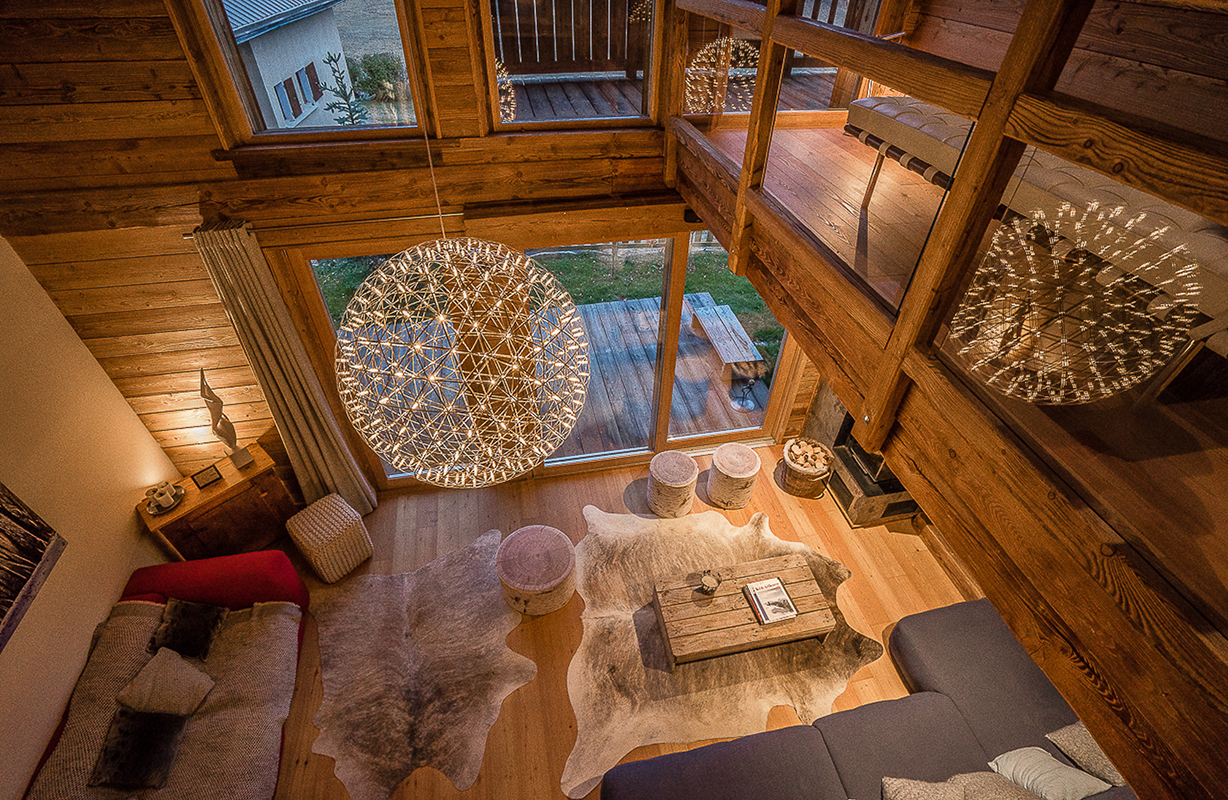 The twin chalets are connected by an underground tunnel and share a swimming pool, a wellness area and a cinema/disco room. The spacious, bright and modern interiors clearly reveal the attention to detail, the natural beauty of the exposed wooden structure and the simple and absolutely original furnishing choices