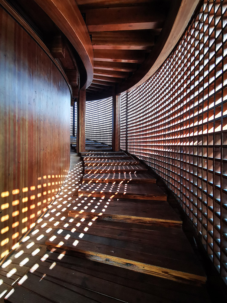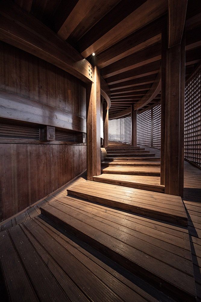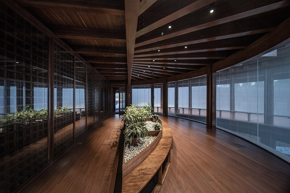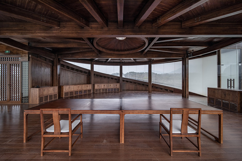 The meditation room on the second floor is multifunctional. Thanks to the opening in the roof, a ray of sunlight is projected onto the floor, which is made of bronze plates that vary according to the Chinese time to be indicated and creates a connection between nature and time
