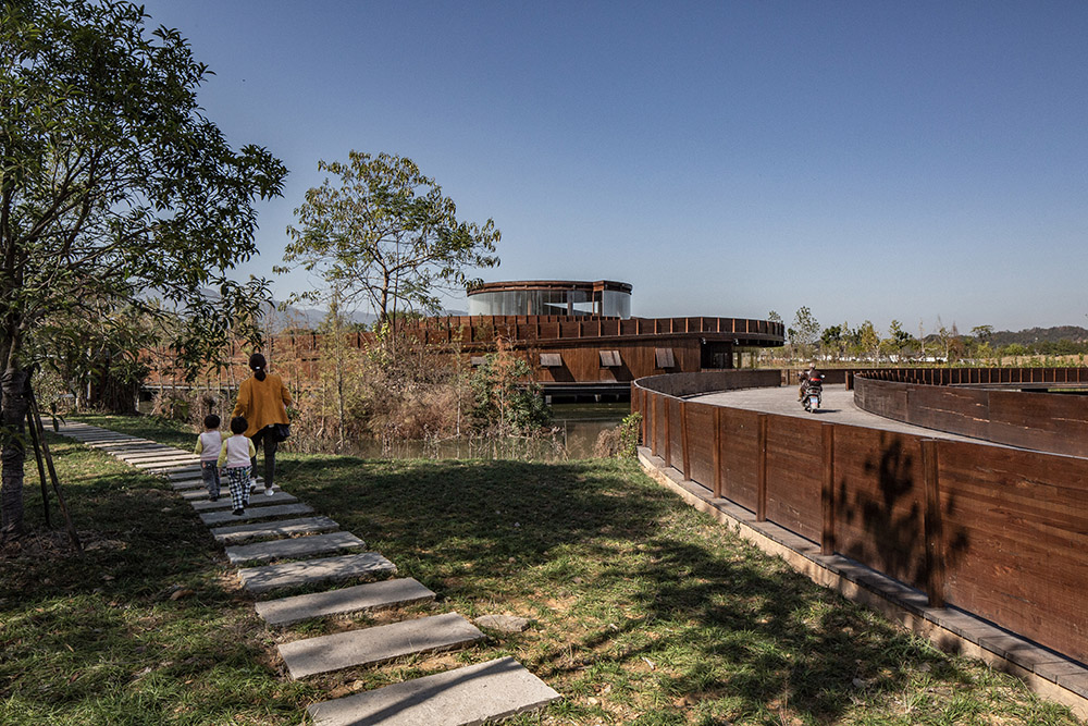 The project is the first meeting point for residents and tourists in the county. The architecture is designed in a spiral pattern with guest facilities in the centre and a gymnasium at the end. A concrete "C" shaped dam also becomes a walkway for pedestrians and bicycles