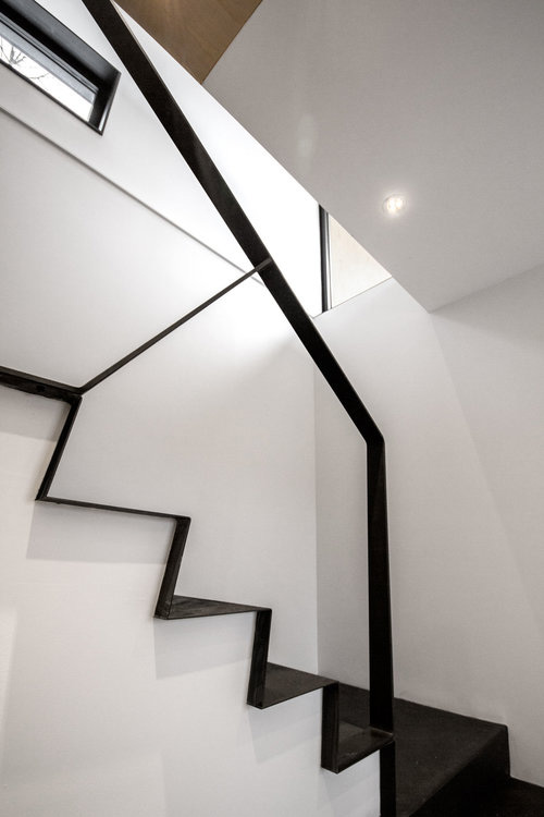 Black metal framed stairs run down behind the gray unit containing the fireplace and log shed to the lower floor, where there is a second bedroom, bathroom and storage room