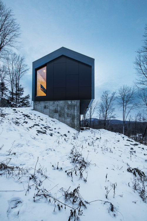 On the border between Quebec and Vermont, architect David Dworkind has built Bolton Residence, a two-storey villa composed of two superimposed structures anchored at the end of a slope from where it seems to float among the trees