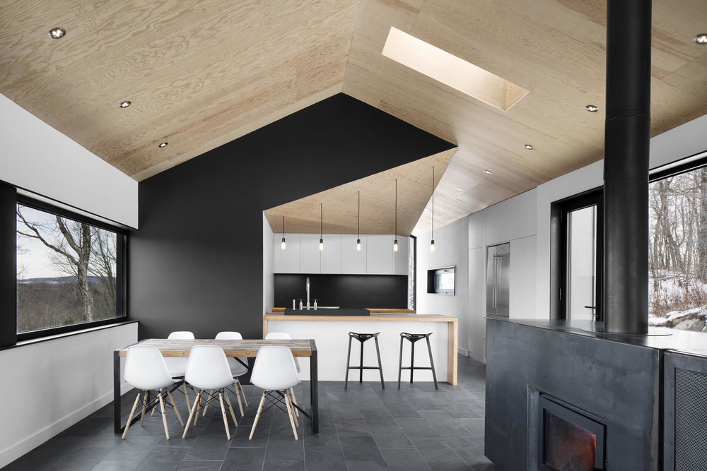 Canadian architect David Dworkind has created a two-storey villa composed of two superimposed structures, lying on top of a slope from where they seem to float among the trees of this vast mountain area on the border between Quebec and Vermont