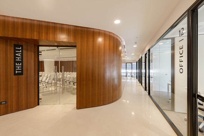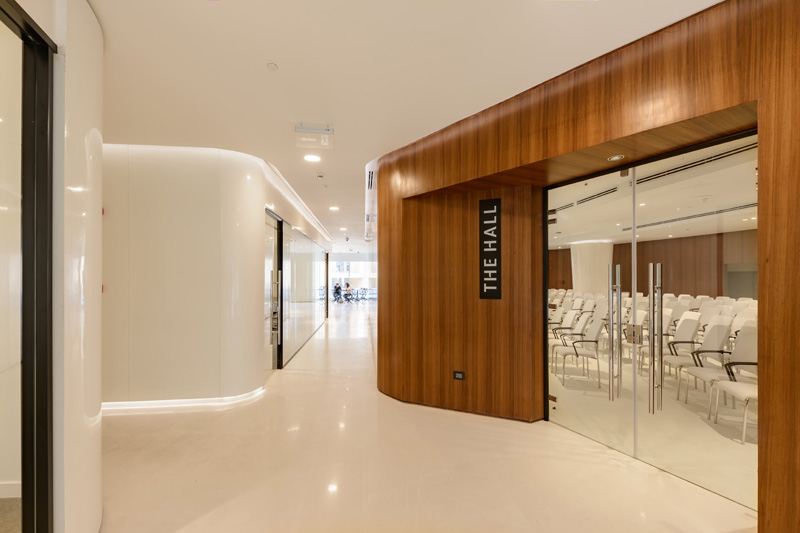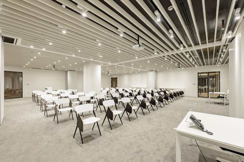 The closed volumes are made of white satin finish and characterized by indirect led light, while the accesses or the centre of the conference room is covered with wood