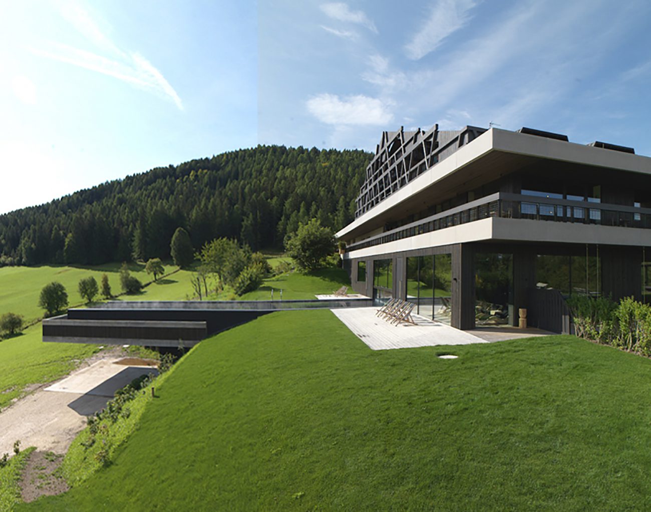 The components of the facade have a special processing, which ensures its durability. In order to further integrate this hotel on the edge of the forest into its natural environment consisting of local wood and to underline the main building, all disturbing elements, such as cars, which are now located in the underground garage, have been eliminated as much as possible. The resulting free space has led to a new, more harmonious and natural connection between the buildings