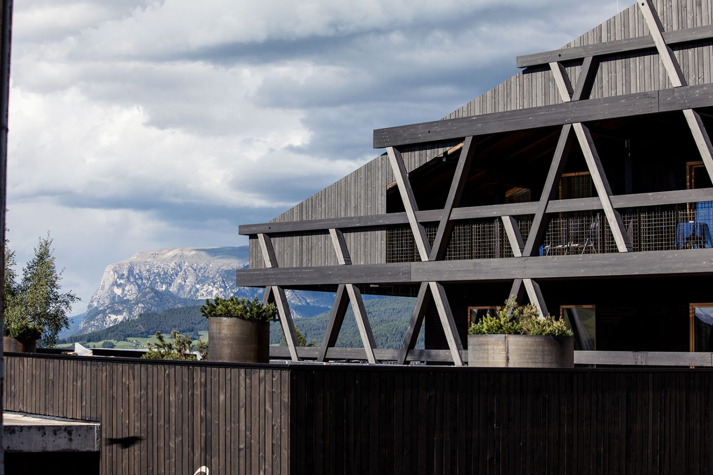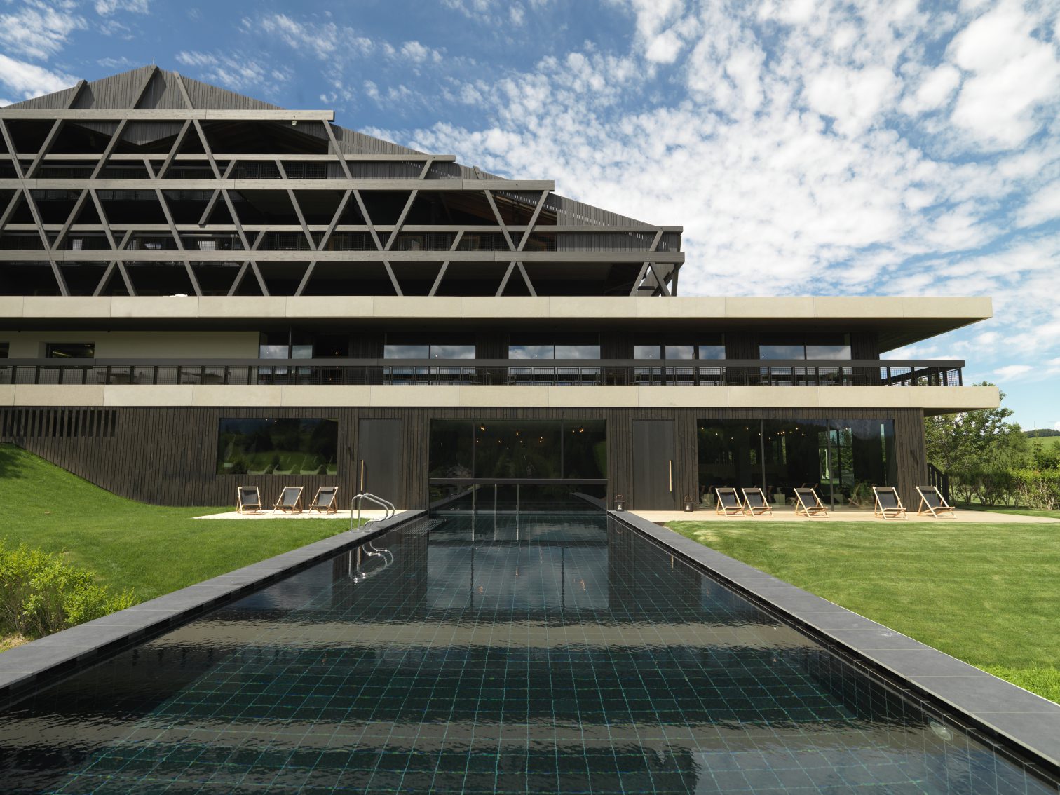 As part of the expansion by the Bergmeisterwolf architectural studio, not only were the exterior spaces renovated, but also the exterior appearance of the building underwent significant changes. The structure of the facade, made of dark larch glulam elements, aligned horizontally and diagonally, gives the hotel a new architectural shape. The components of the facade have a distinctive processing, which ensures its durability