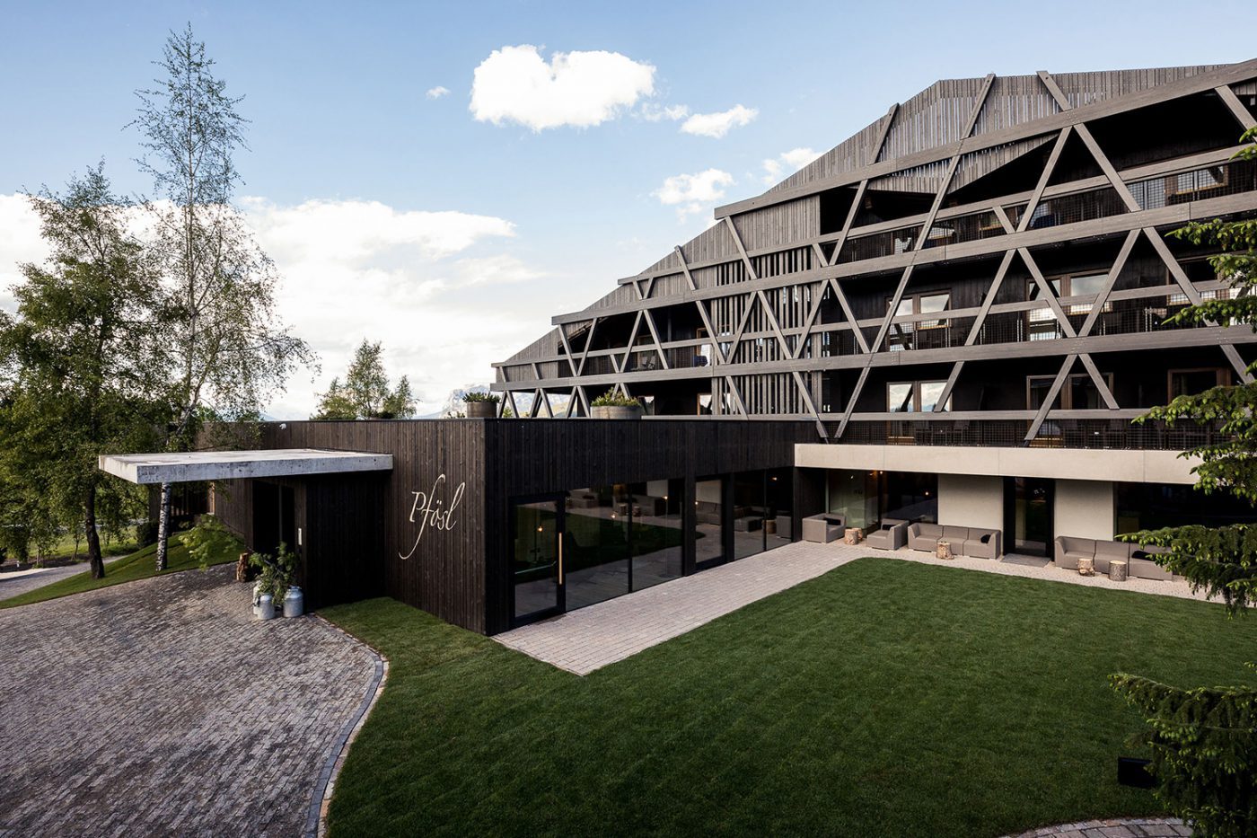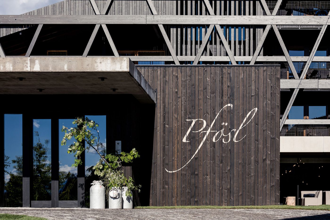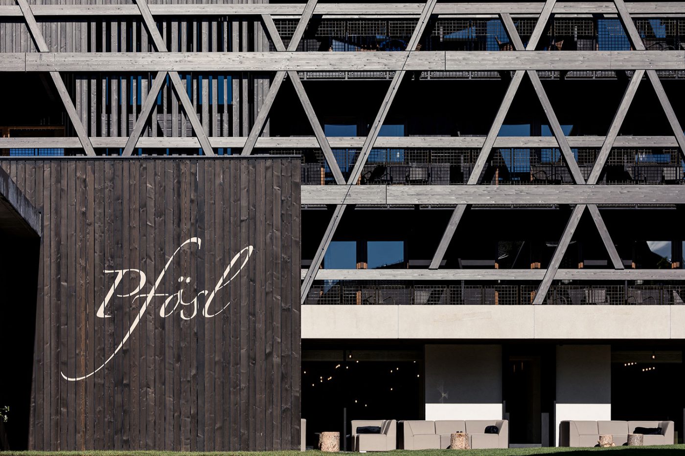 The façade structure, consisting of dark glulam elements aligned horizontally and diagonally, gives the Pfösl Hotel a new architectural form