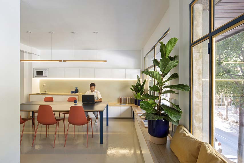 Located on the mezzanine floor of a residential building from the 1960s, this space once housed a textile warehouse. The building reflects the typical functional layering of the era: commercial activities on the ground floor, offices and laboratories on the main floor, and residences on the upper floors. A reimagined historic space, as we see in other architectural projects, to accommodate an open, bright, and functional work environment.