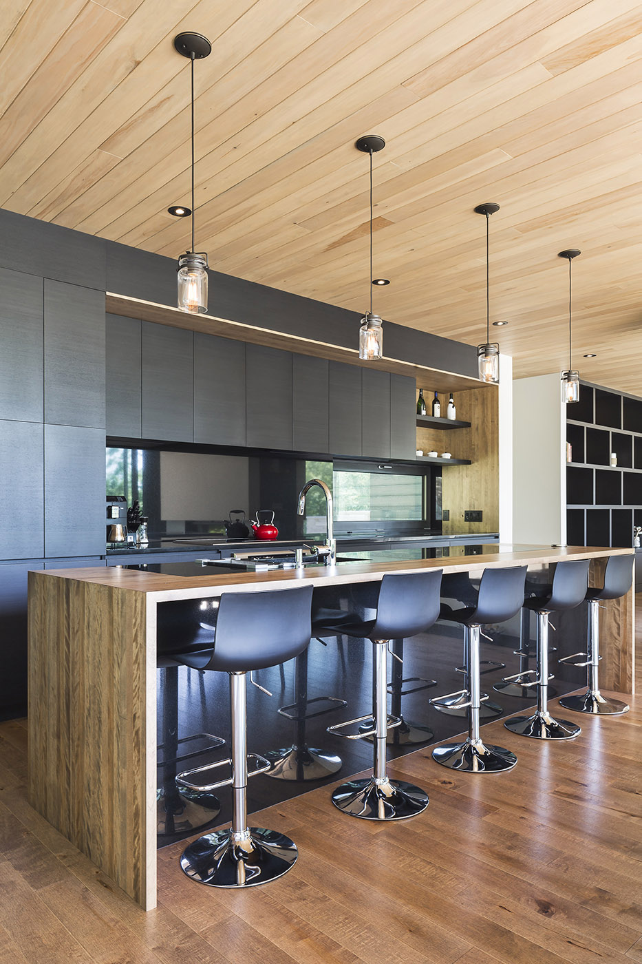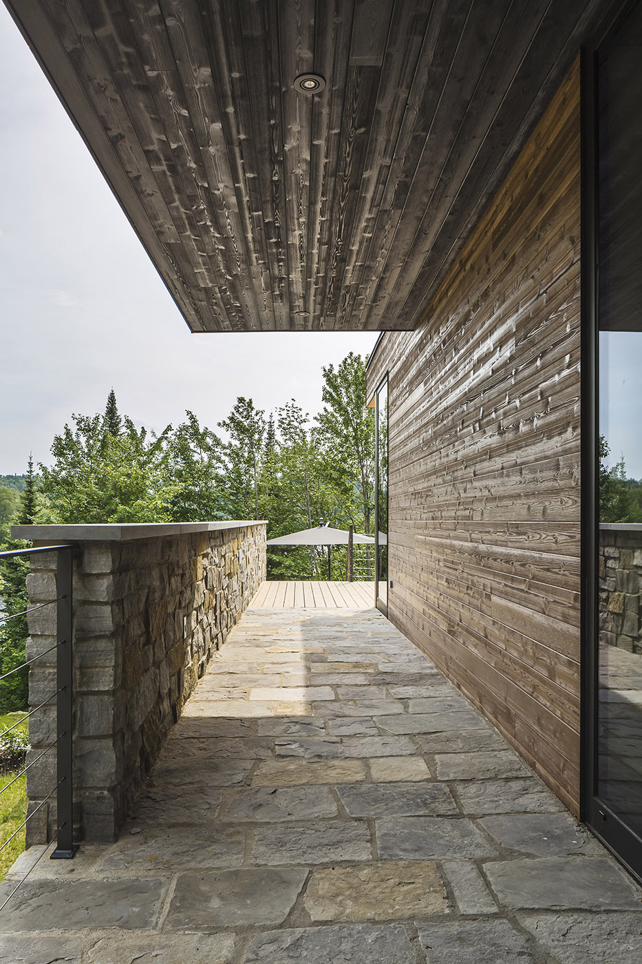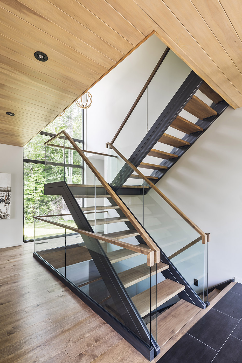 Located in Saint-Adolphe-d'Howard, Quebec, Villa Estrade is composed of a series of animated volumes by MU Architecture that anchor, skirt and soar over the topographical irregularity. Their staggered and overlapping arrangement generates a multitude of terraces that embrace the site, creating a rich dialogue between architecture and wild landscape