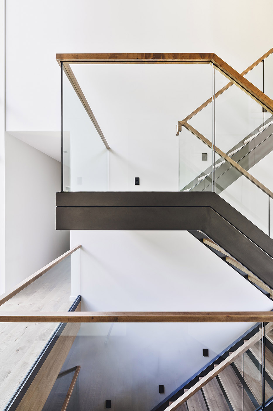 A large recess under what seems to be a floating cube invites us to penetrate the place. From the entrance, an aerial and masterful staircase welcomes the visitor and winds through a vast luminous space, connecting all the levels in asymmetrical flights. Minimalism and attention to detail create a sense of purity and comfort that immediately sets the tone for the project