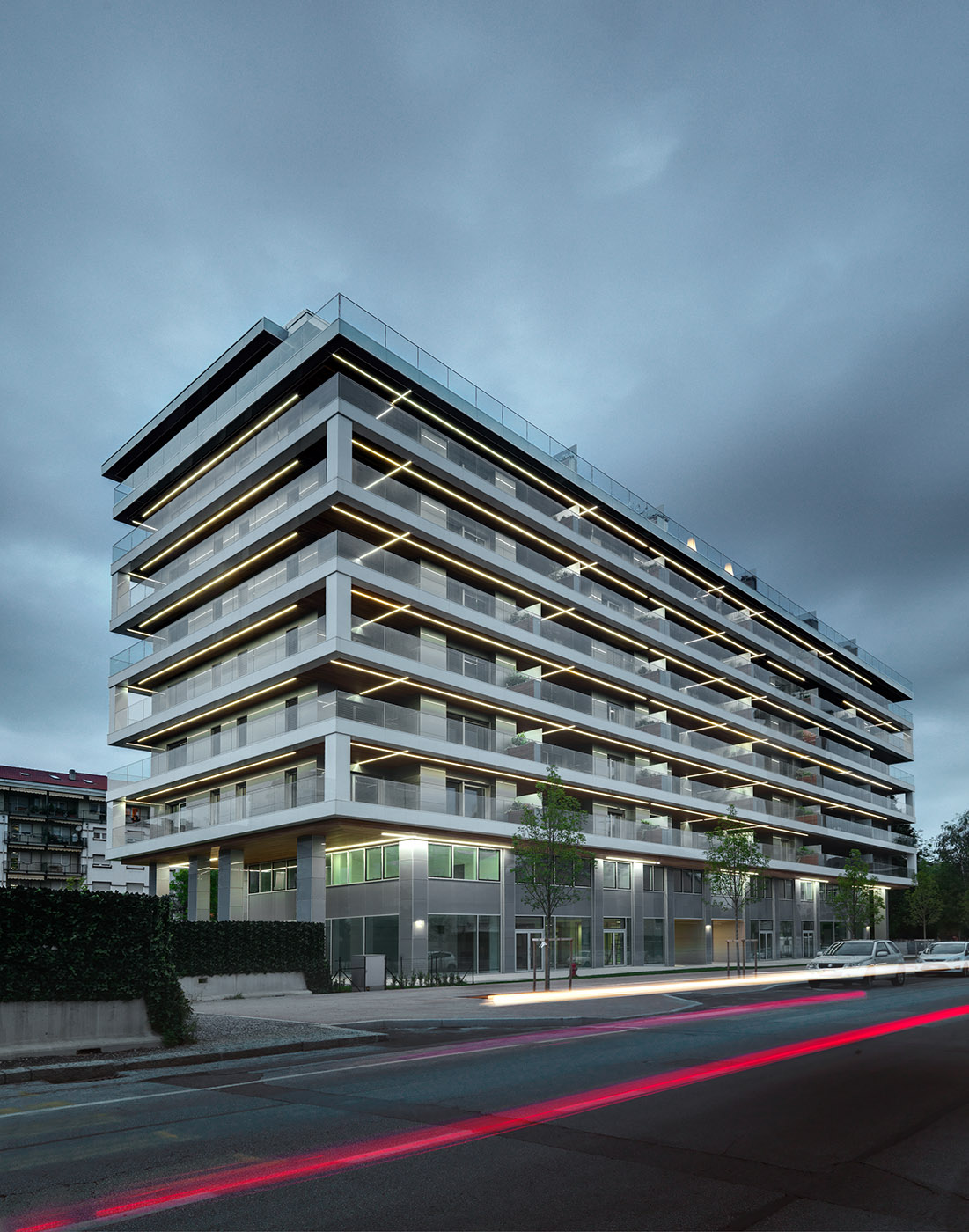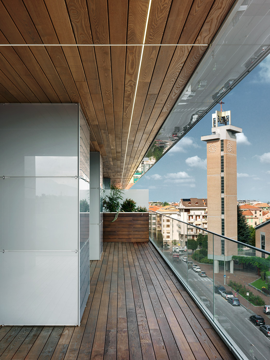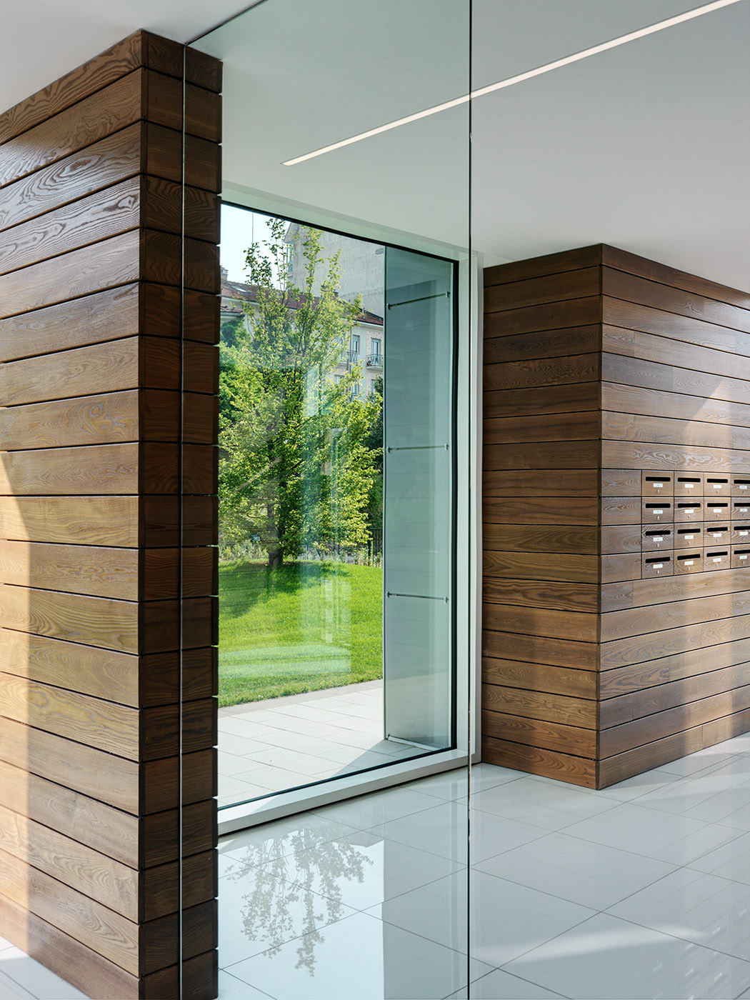 Tutti gli ambienti degli alloggi offrono una vista sull'arco alpino circostante e l'edificio è interamente circondato da balconi che talvolta si allargano a diventare terrazze. Qui entra in gioco Faraone con i suoi parapetti Ninfa in vetro e alluminio che rendono lo spazio unico per le persone che abitano gli alloggi che possono godere del paesaggio, rendendo anche più accattivante l’estetica della facciata
