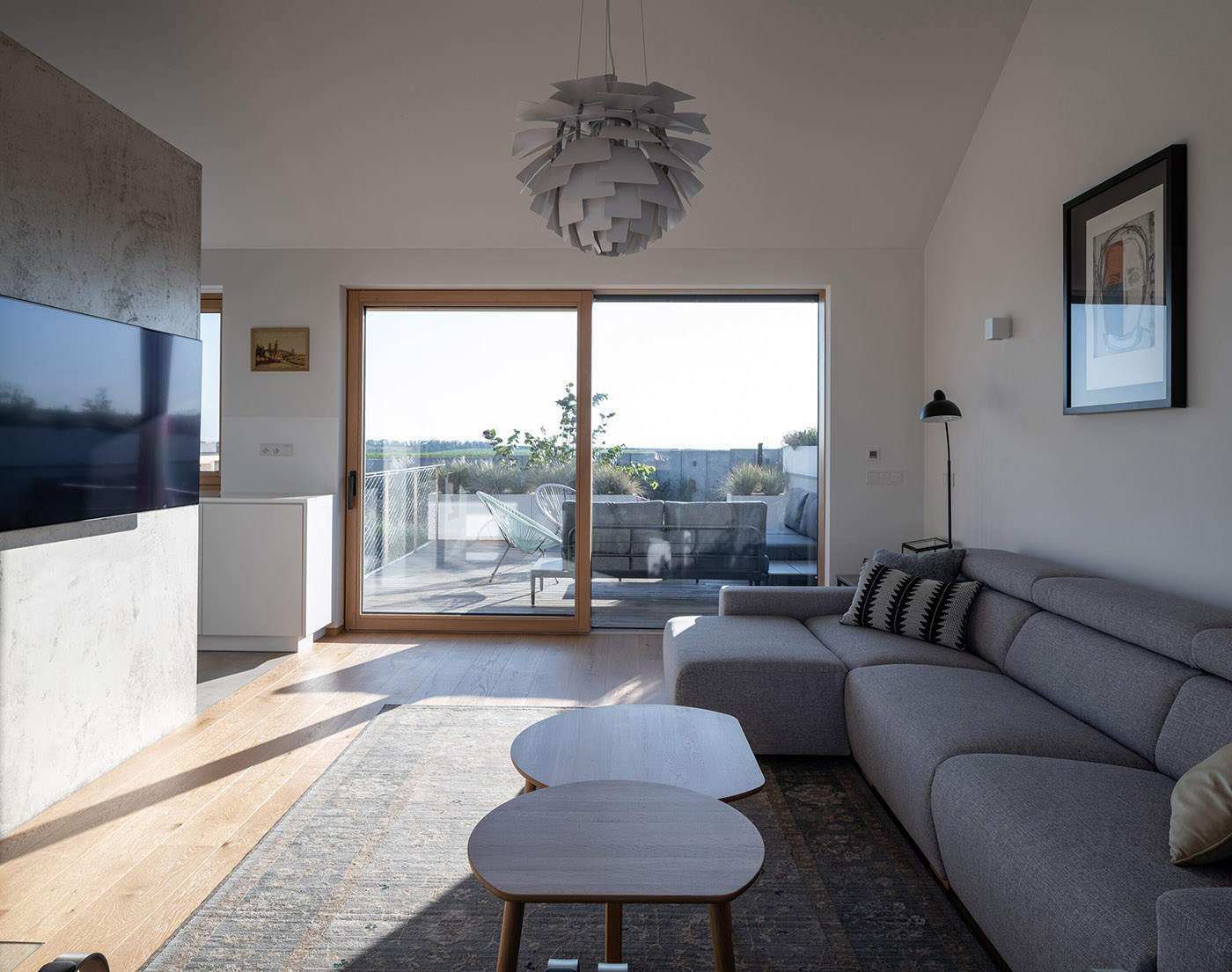 The design by SENAA architekti reflects the morphology of the land. A semi-recessed atrium provides a comfortable exit from the ground floor and slopes down to the garden. The garden is an extension of the interior space, with its outdoor living and kitchen-dining area. The general composition of the house is symmetrical. The main entrance is centrally located. A vestibule leads into a spacious hall. The dignity of the space is amplified with the view of the inner atrium