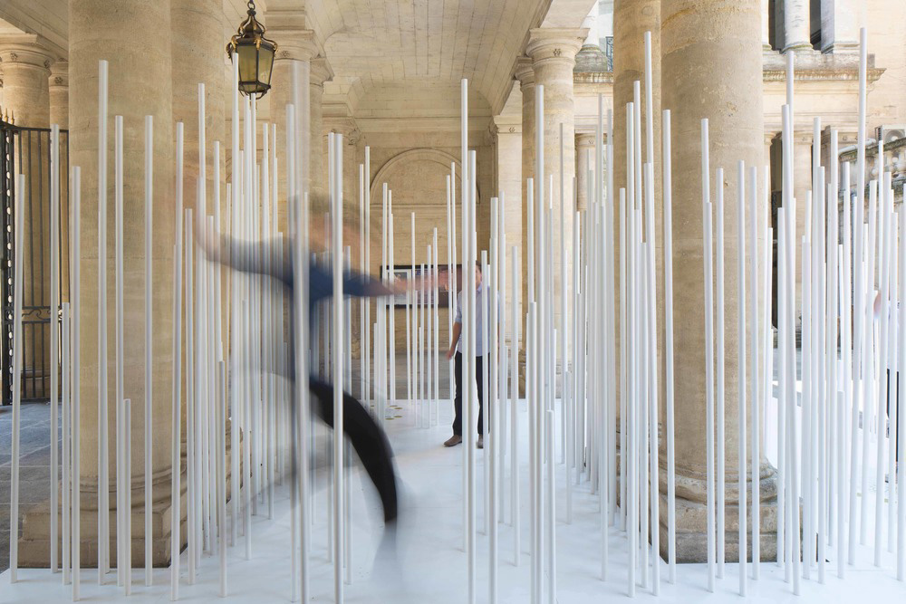 Its repetition makes it possible to create a forest of poles, generating a new spatiality and a connection with the existing stone columns.