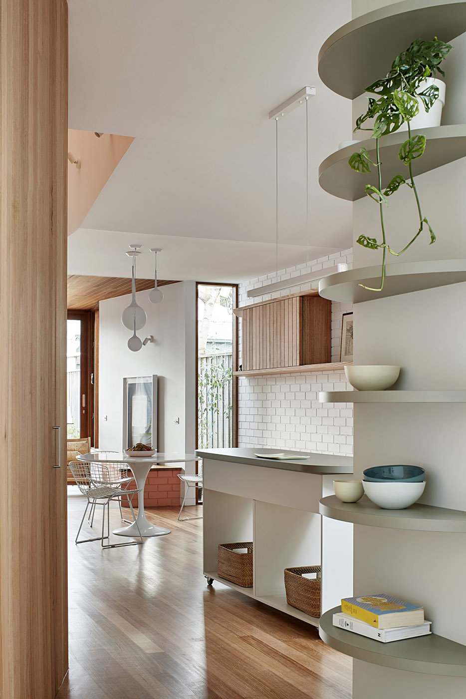 The old and new are separated by a courtyard, which promotes lighting and ventilation. The expansion makes room for a studio and the curved wooden wall, enclosing a shop welcomes visitors upon arrival