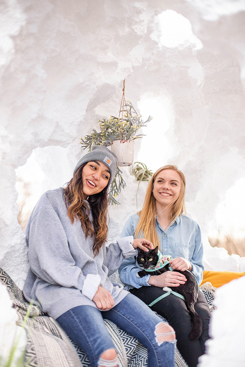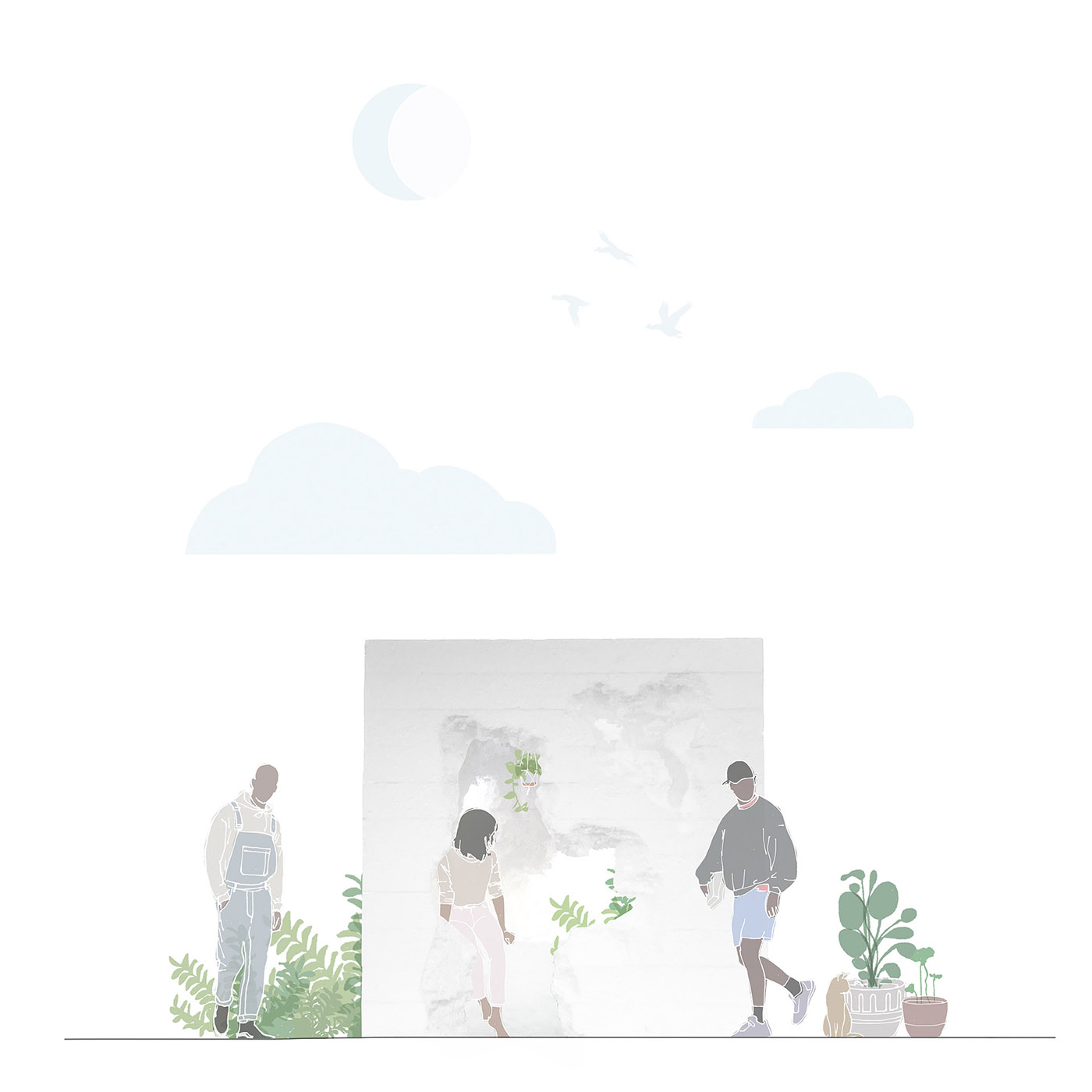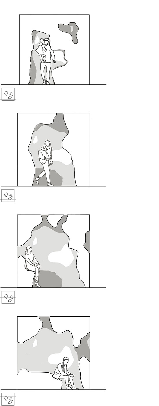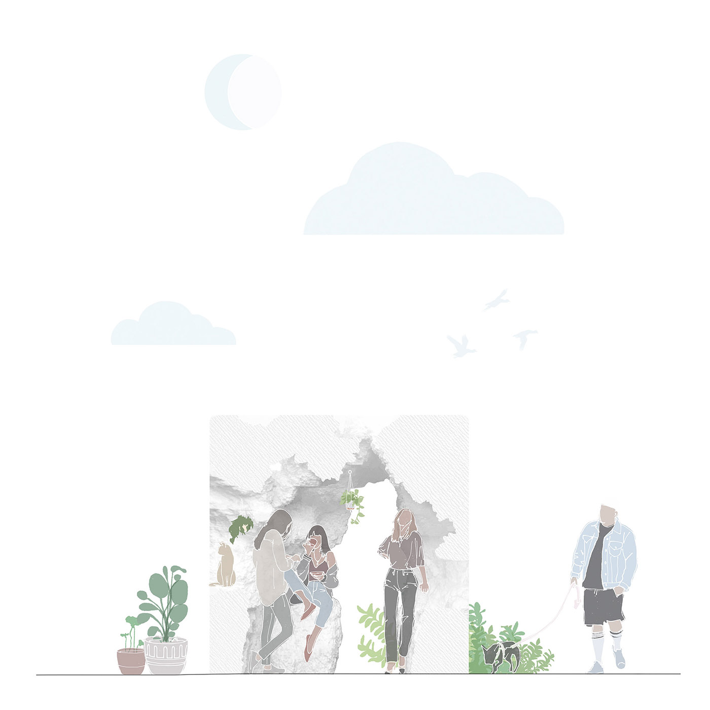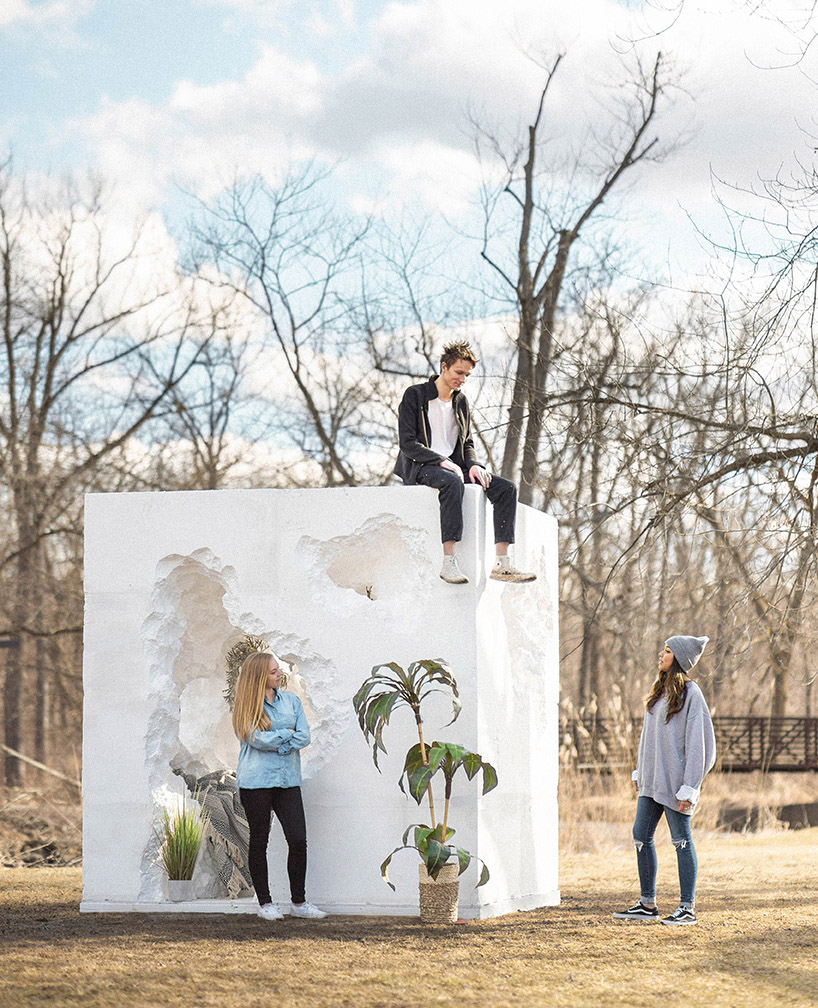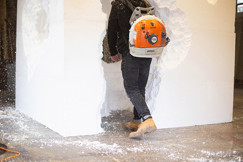 The designers did not set out to create a building, but rather a primordial form that can be adapted into a building. The construction process began with the collection, reuse, and arrangement of EPS foam blocks into an eight by eight foot cube. Next, the foam was eroded through high-pressure water and sprinklers to form a small cave, capable of supporting a variety of programs and uses