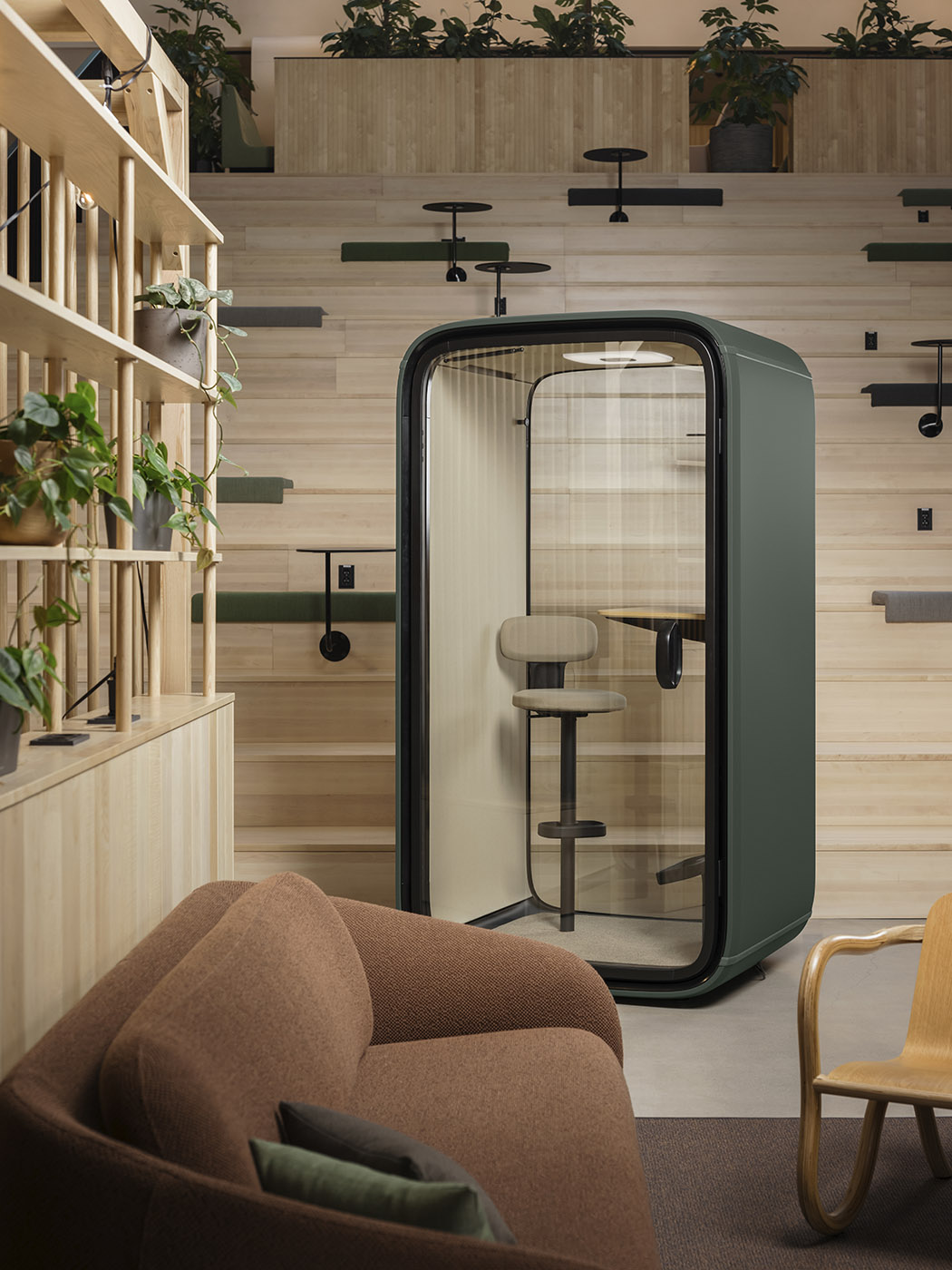 The designers set out to create a product that would solve these evolving workplace needs and developed a personal workspace for efficient video conferencing. Using Framery One, virtual meetings and conference calls can take place within these spaces without disturbing those around them