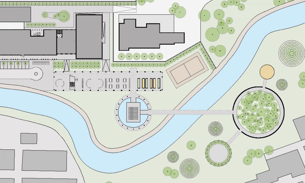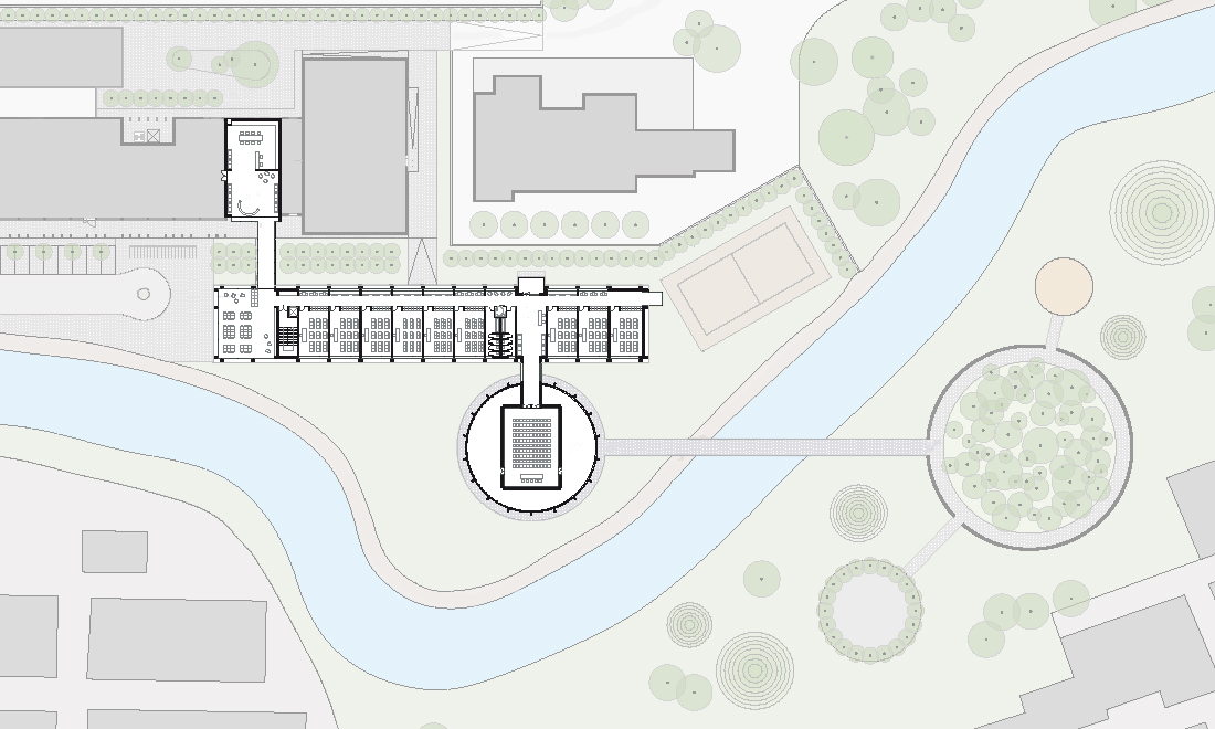 The project introduces the new school to the natural elements: the river and the small park beyond the riverbed.