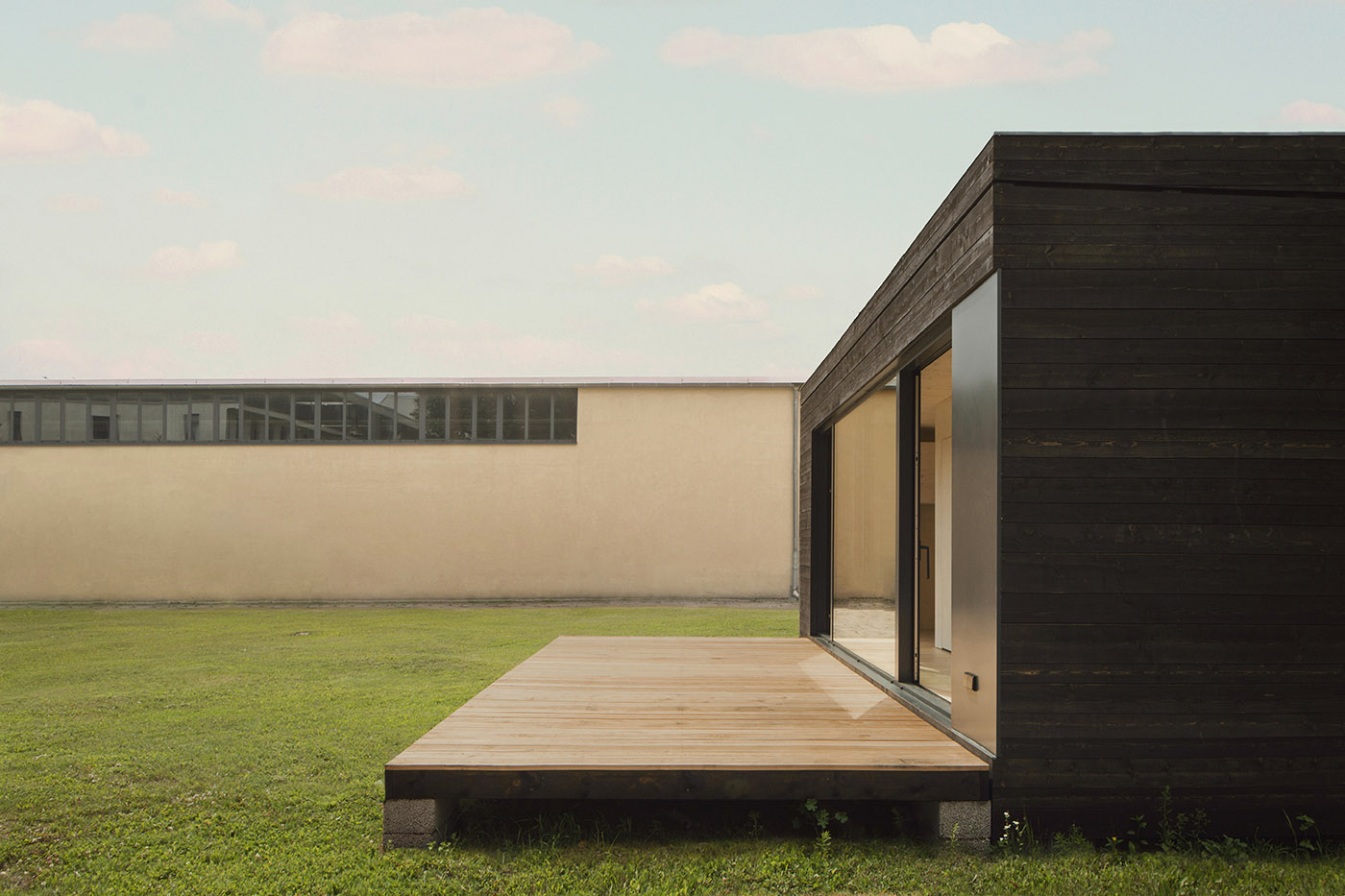 Futteralhaus is the design of a minimal prefabricated house by Transstruktura Architekten studio, ecological and independent of the grid, with a simple floor plan and a large window connecting the interior with a large wooden terrace outdoors