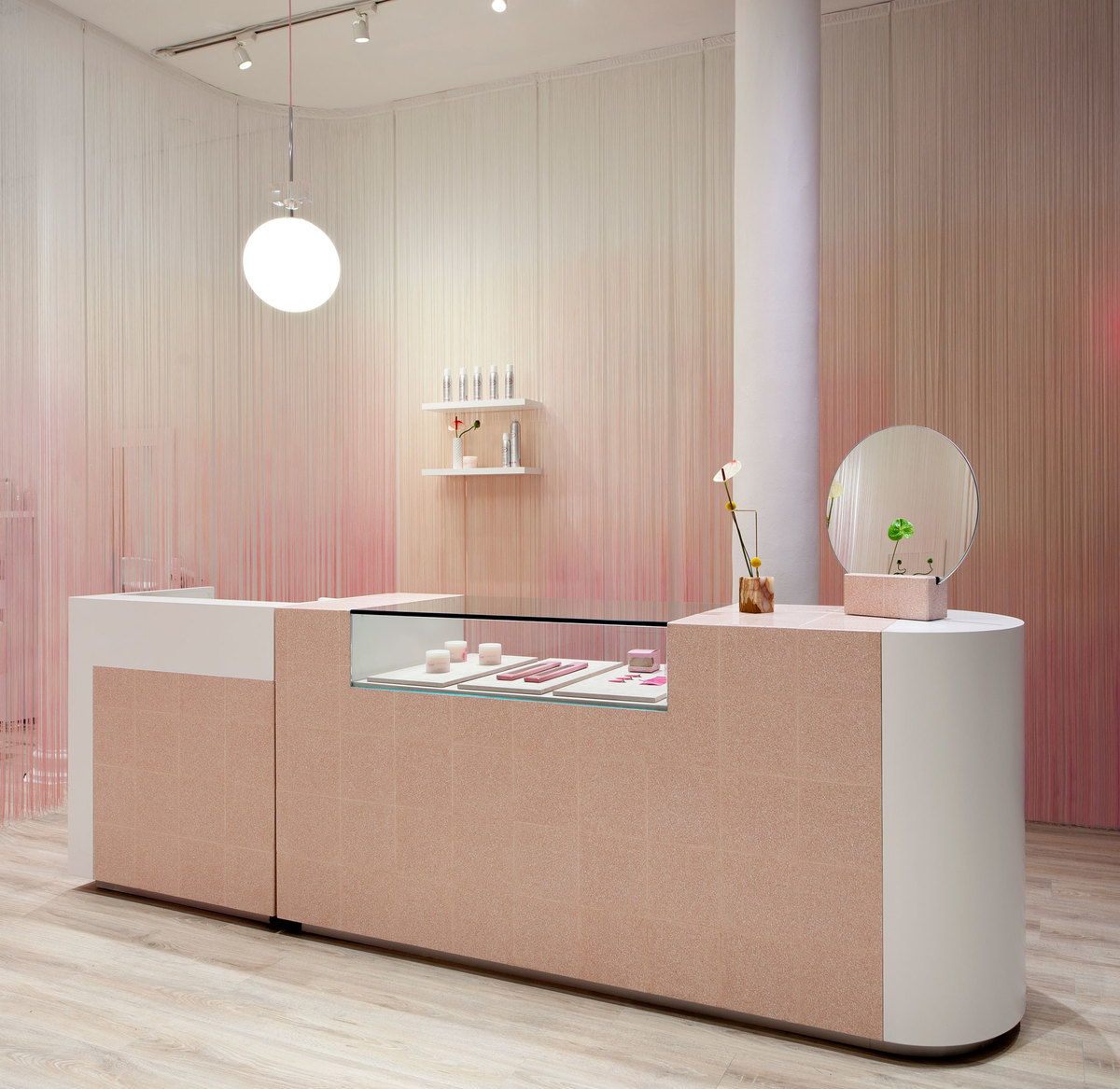 Completed in March 2018, the project was conceived because of the Glam Seamless online company's need for a physical space where customers can check the products of their orders or buy directly, particularly with regard to hair and extensions. The company relies on the Sergio Mannino studio to create its own shop in the heart of Soho, characterized by white and pink colours: a design inspired by the same product, which is both feminine and dreamy