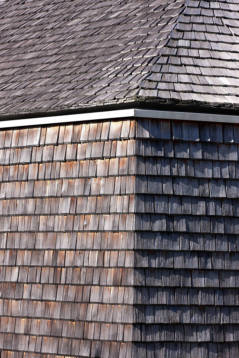 The structure is mixed, made of reinforced concrete and solid wood, and the entire building is clad in local wood tiles, including the two-pitch roof, so that everything looks like a whole area