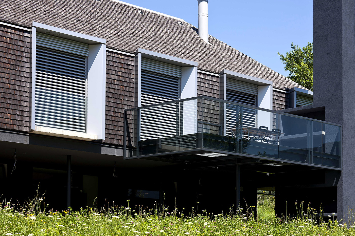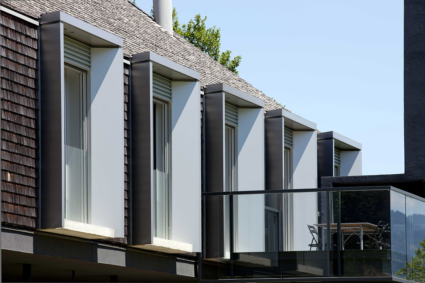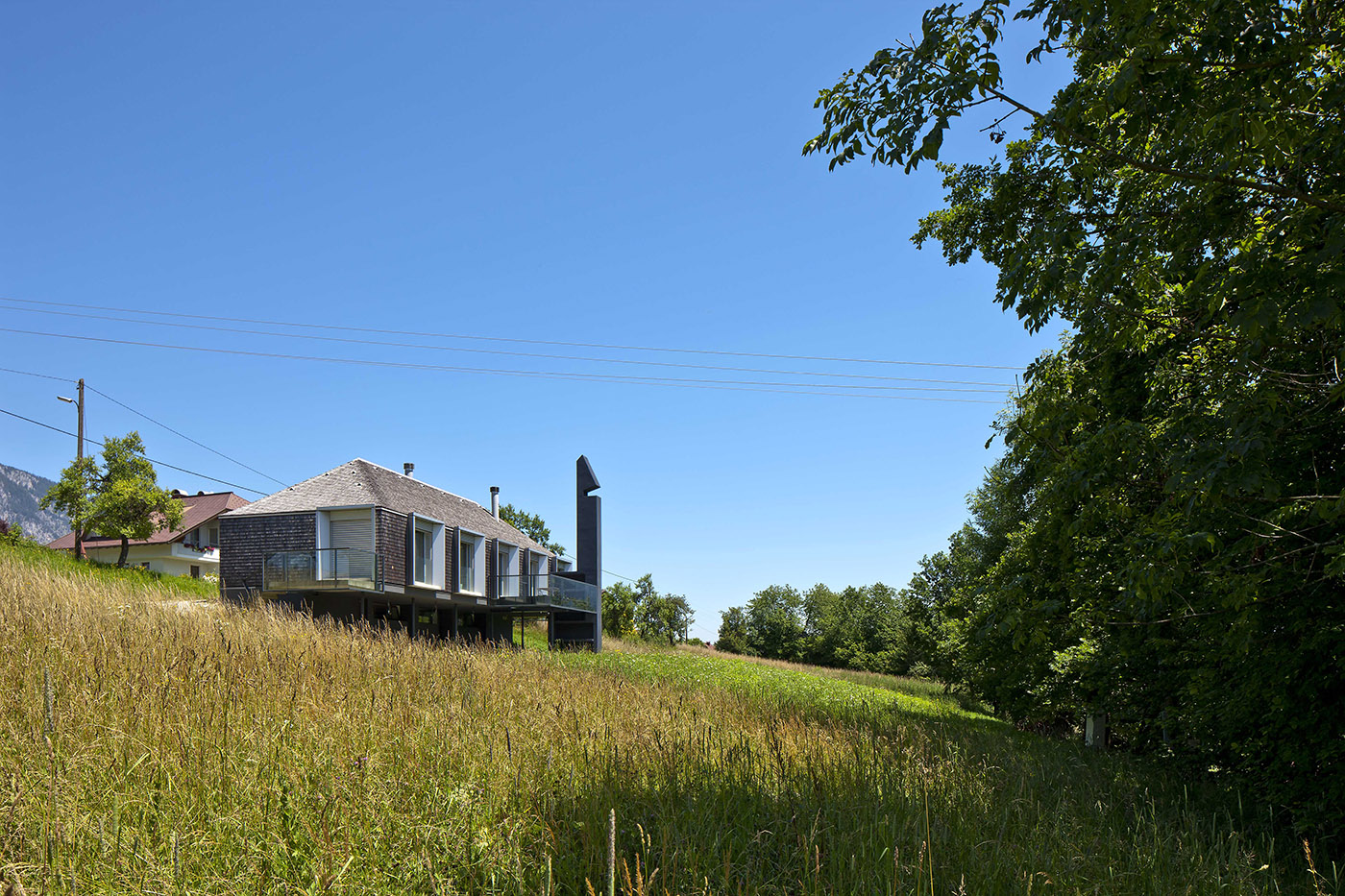 To the south there is a balcony from which you can admire the mountain landscape, which underlines the direct relationship of the building with the surrounding landscape. A distinctive feature of the project are the full-height window openings with aluminium-clad frames