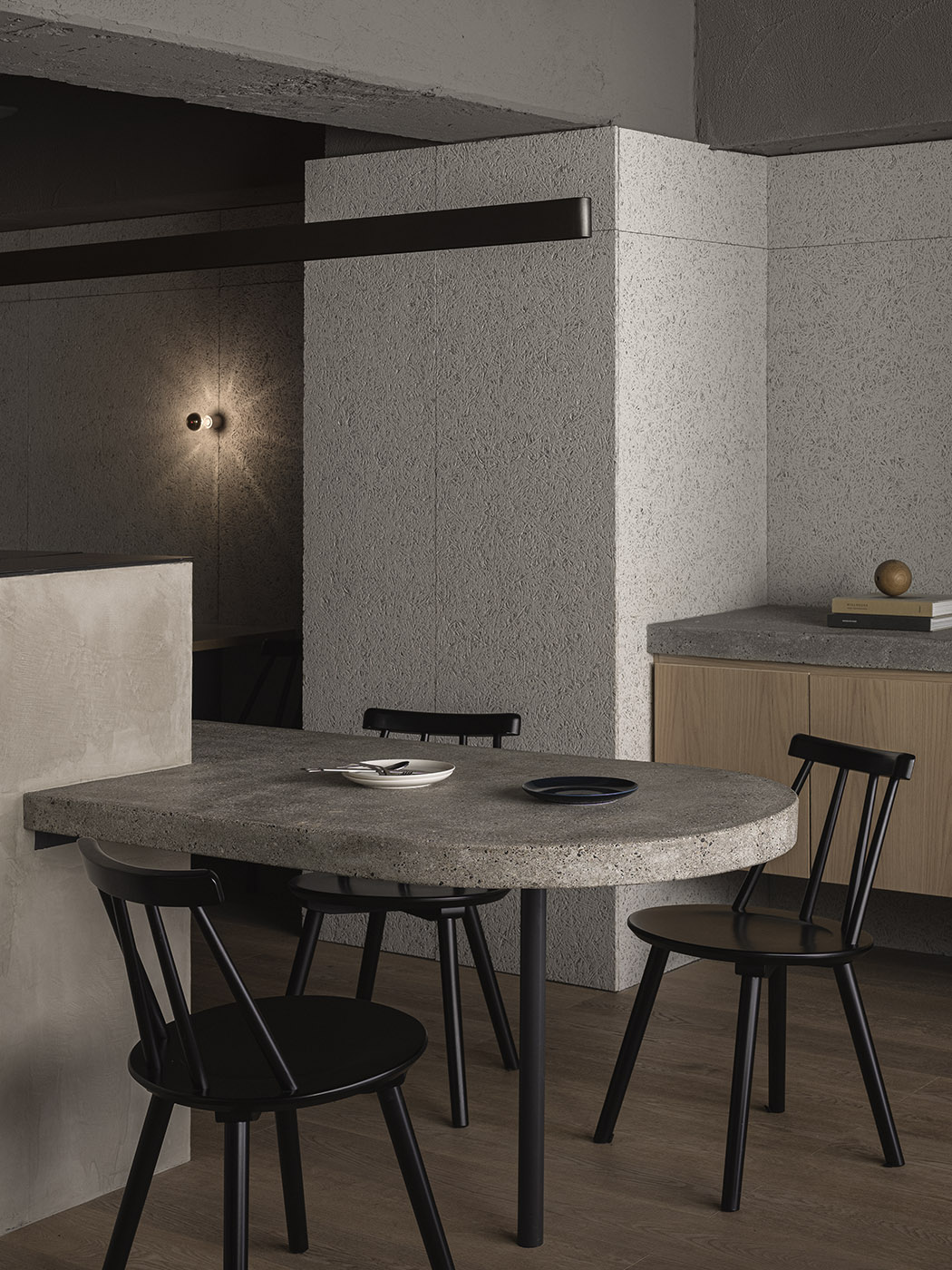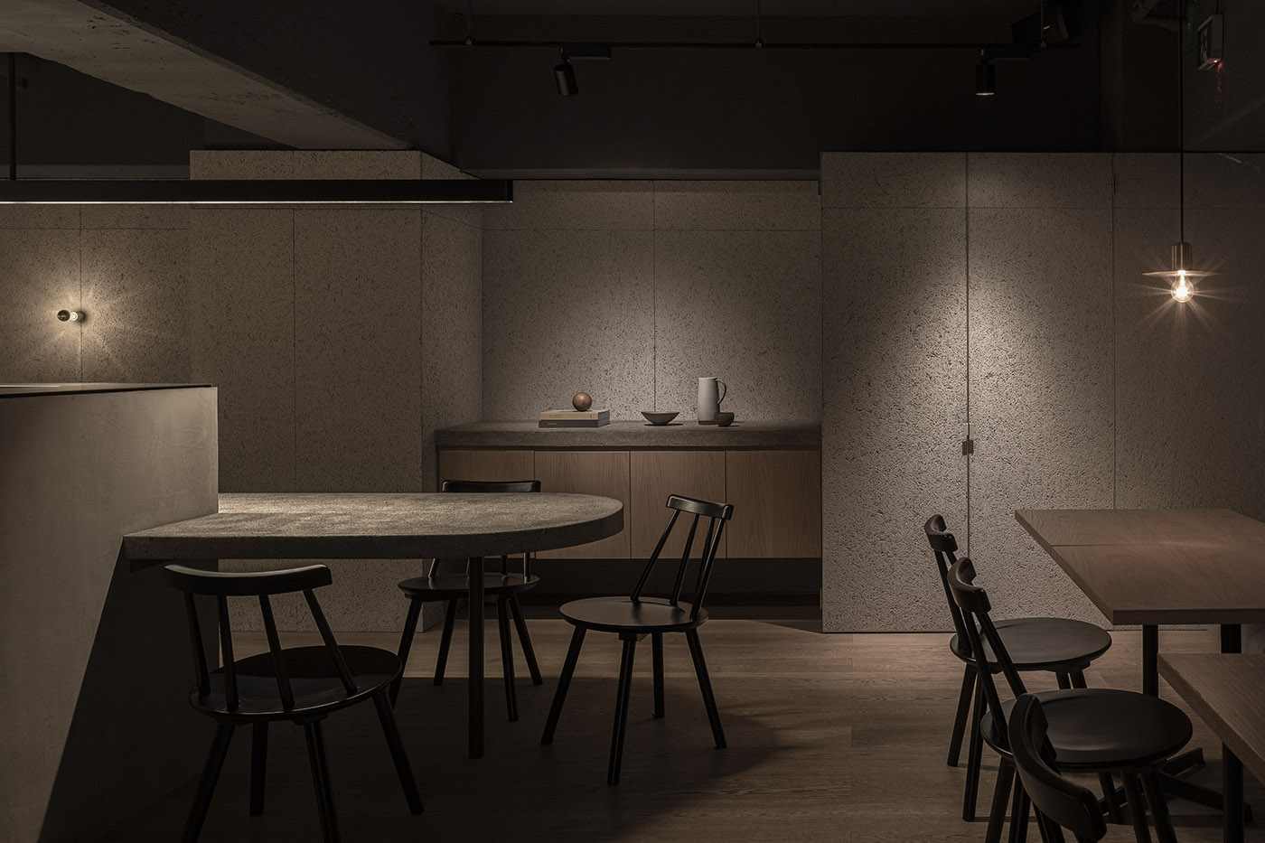 Guiding the design was the concept that good restaurants should be able to accommodate people in many situations: alone, in groups of friends, and with families. To make the most of the space, a variety of seating arrangements were designed. A long countertop table with a rounded end so 3-4 people can sit, a few tables for two or four, and a sofa