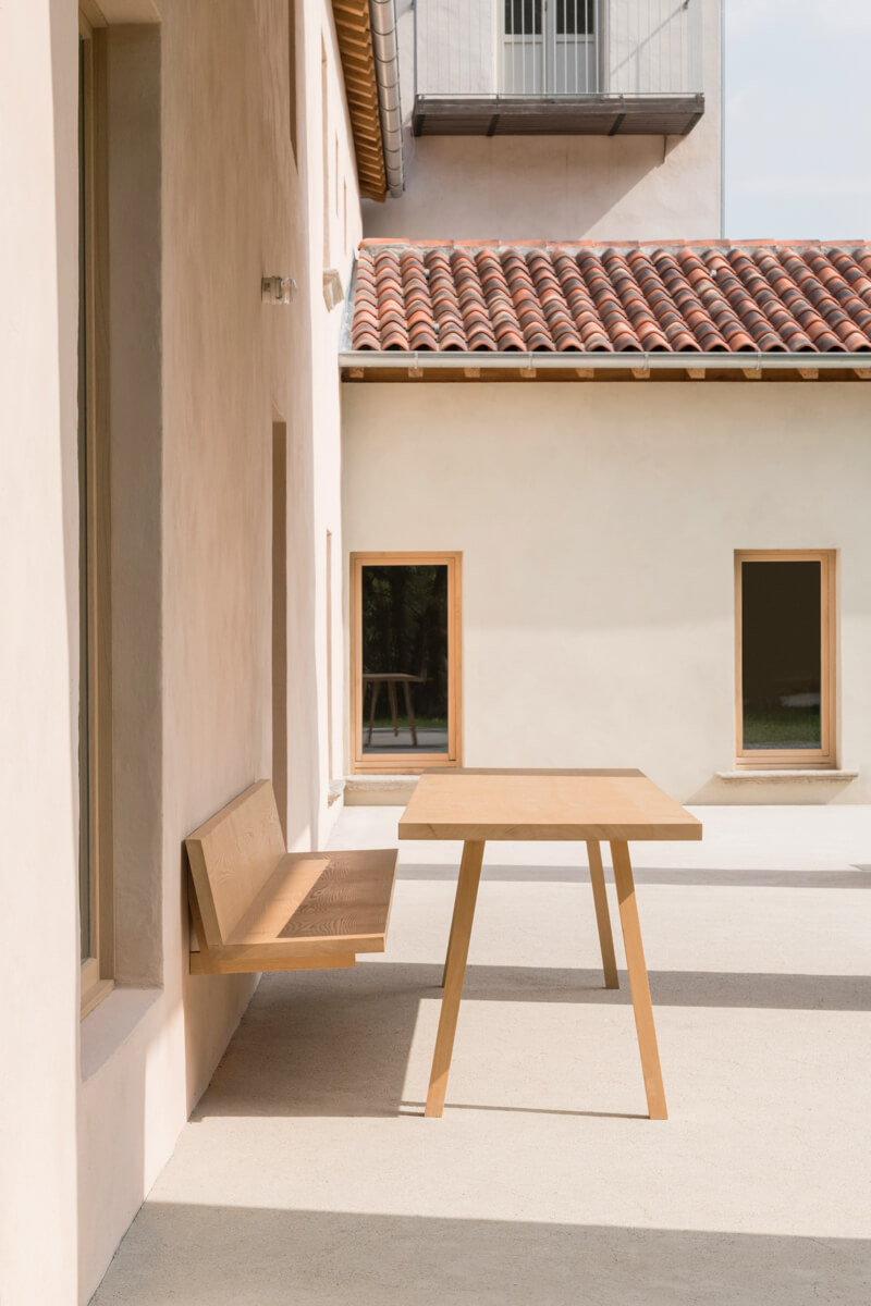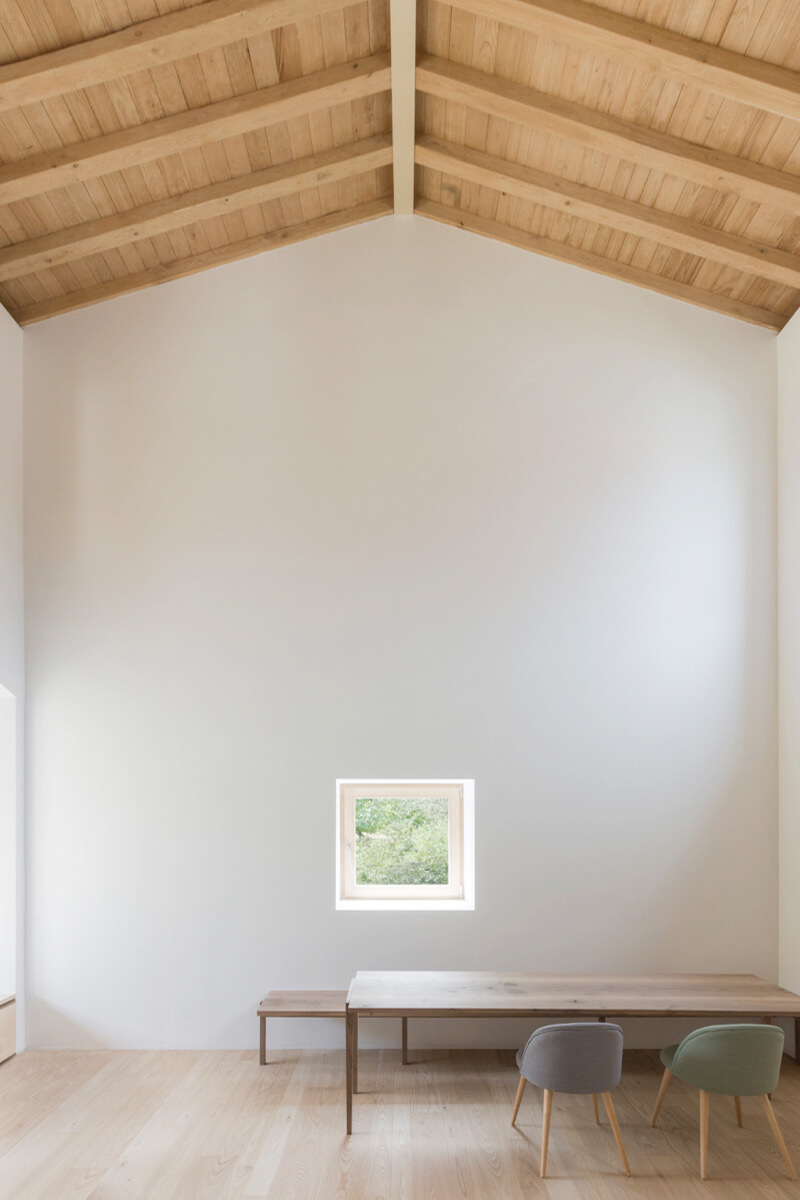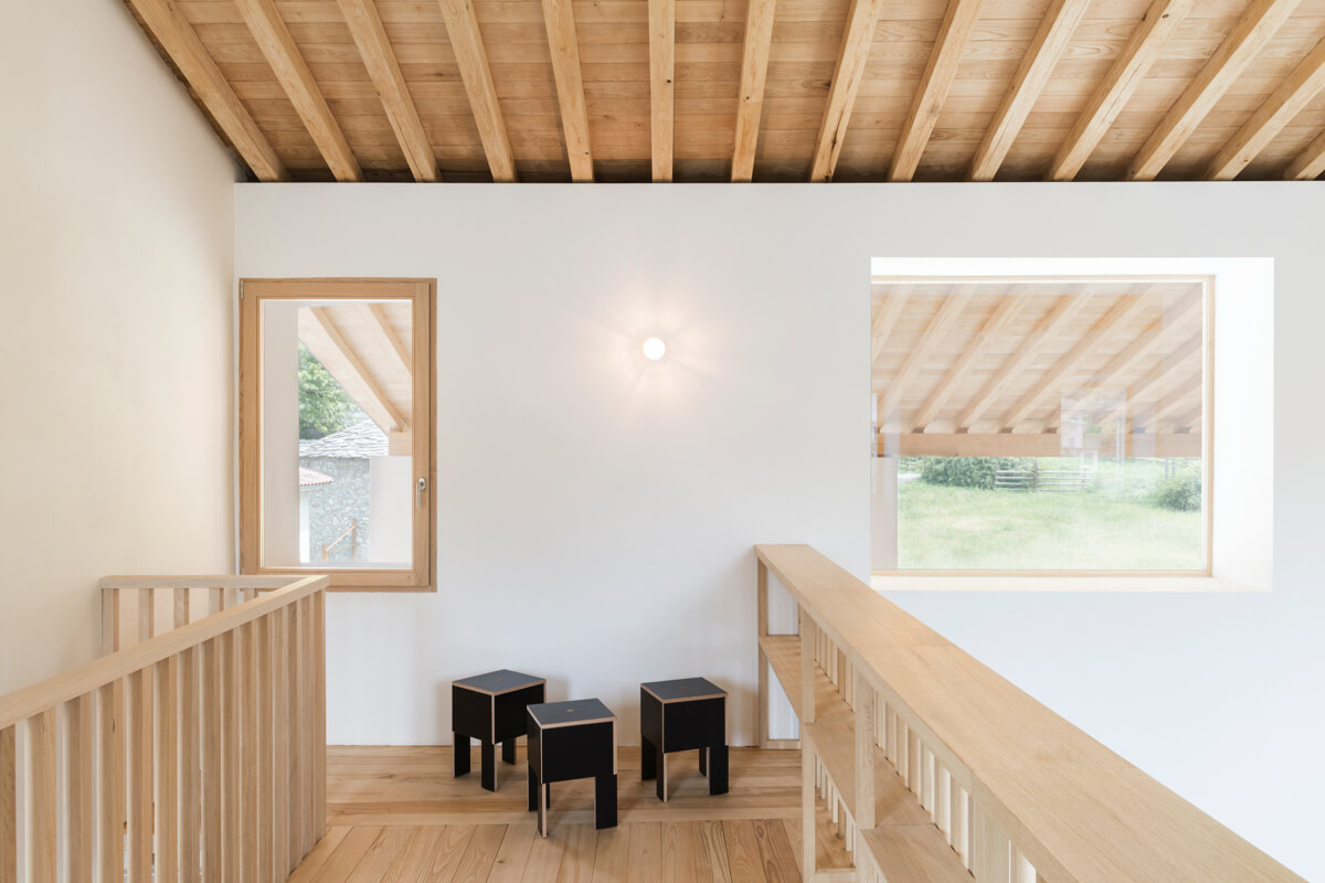 Outside, the plasters have been renovated and new chestnut wood windows and doors have been inserted. Inside, the geometry of the rooms differentiates each room. The common space, the heart of the building, is on two levels overlooking the agricultural part of the property. The agricultural material and the laundry room are located at the street level.