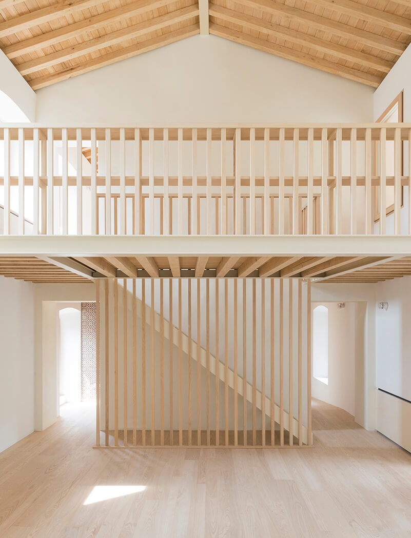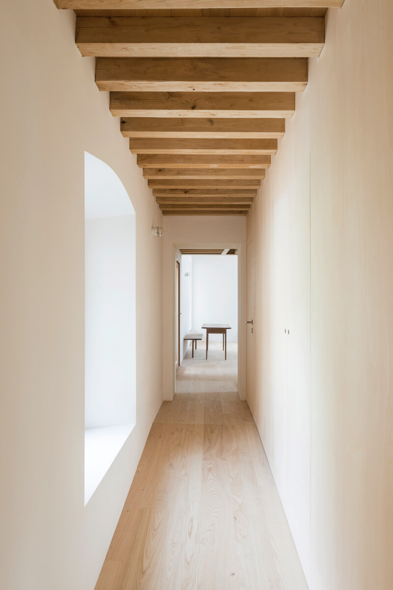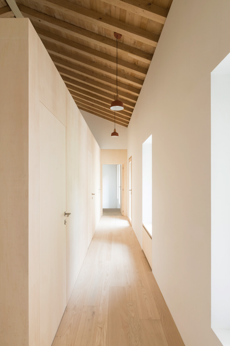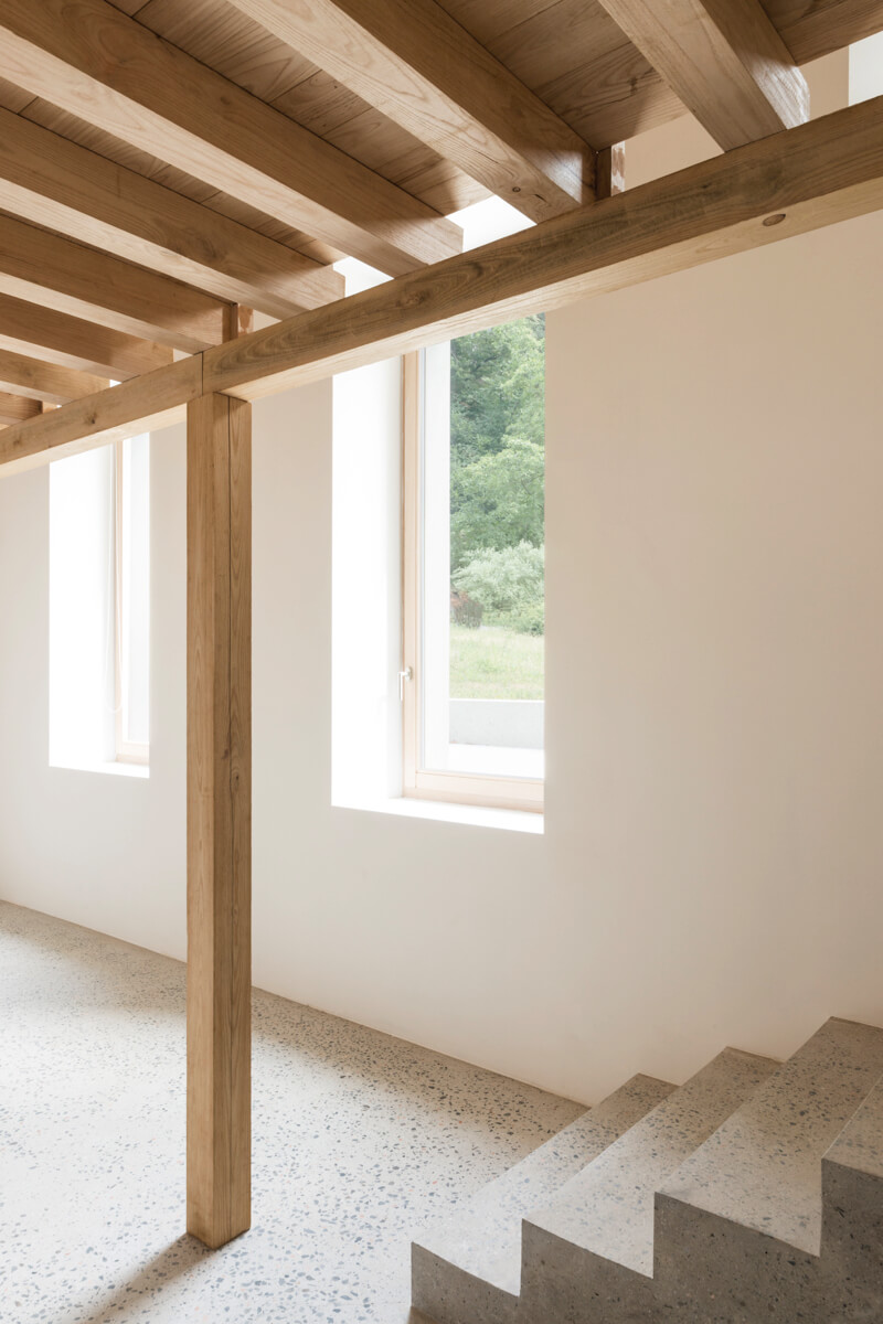 Outside, the plasters have been renovated and new chestnut wood windows and doors have been inserted. Inside, the geometry of the rooms differentiates each room. The common space, the heart of the building, is on two levels overlooking the agricultural part of the property. The agricultural material and the laundry room are located at the street level.