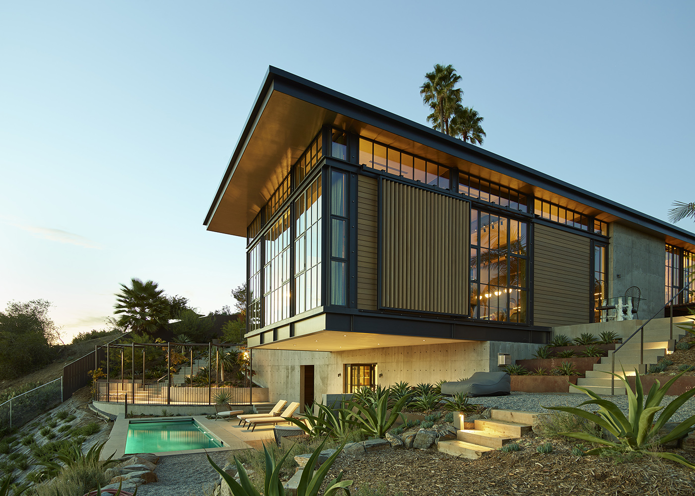 Los Angeles, California. Mutuus Studio accommodates the wishes of its clients, who wanted a small footprint for their family residence, just like their loft in New York. Set on a 45% slope, Hollywood Hills House proves to be a real challenge for its design team