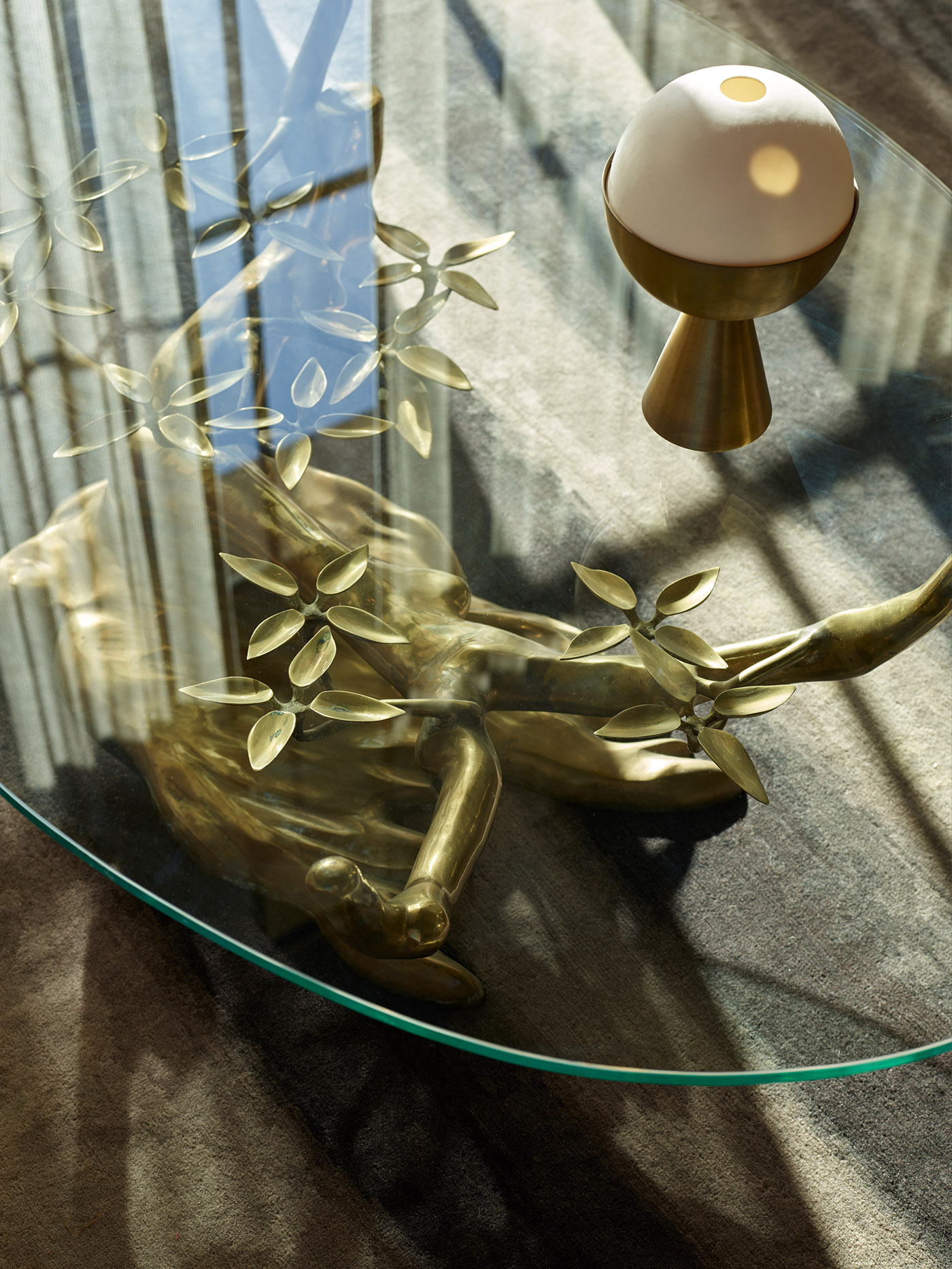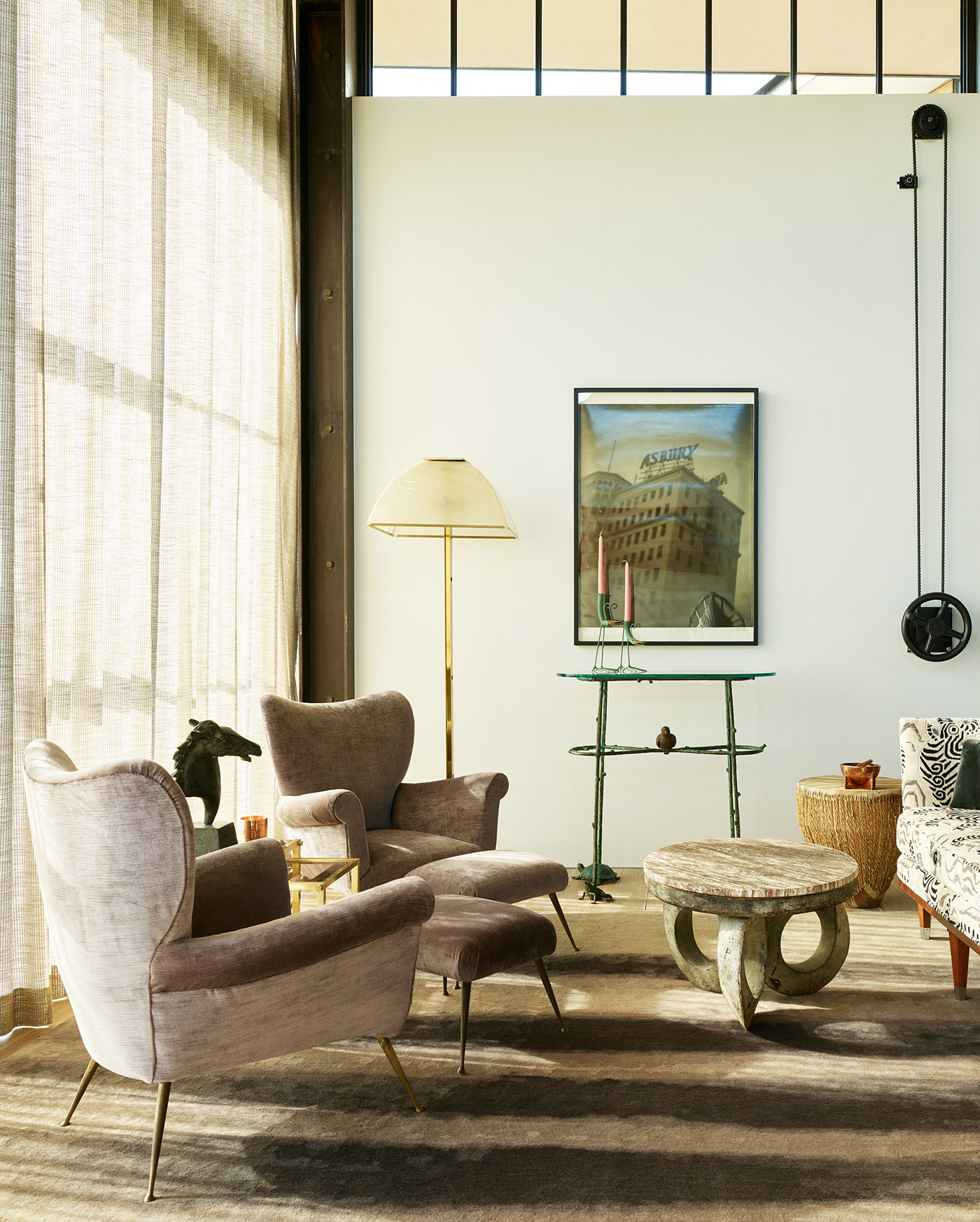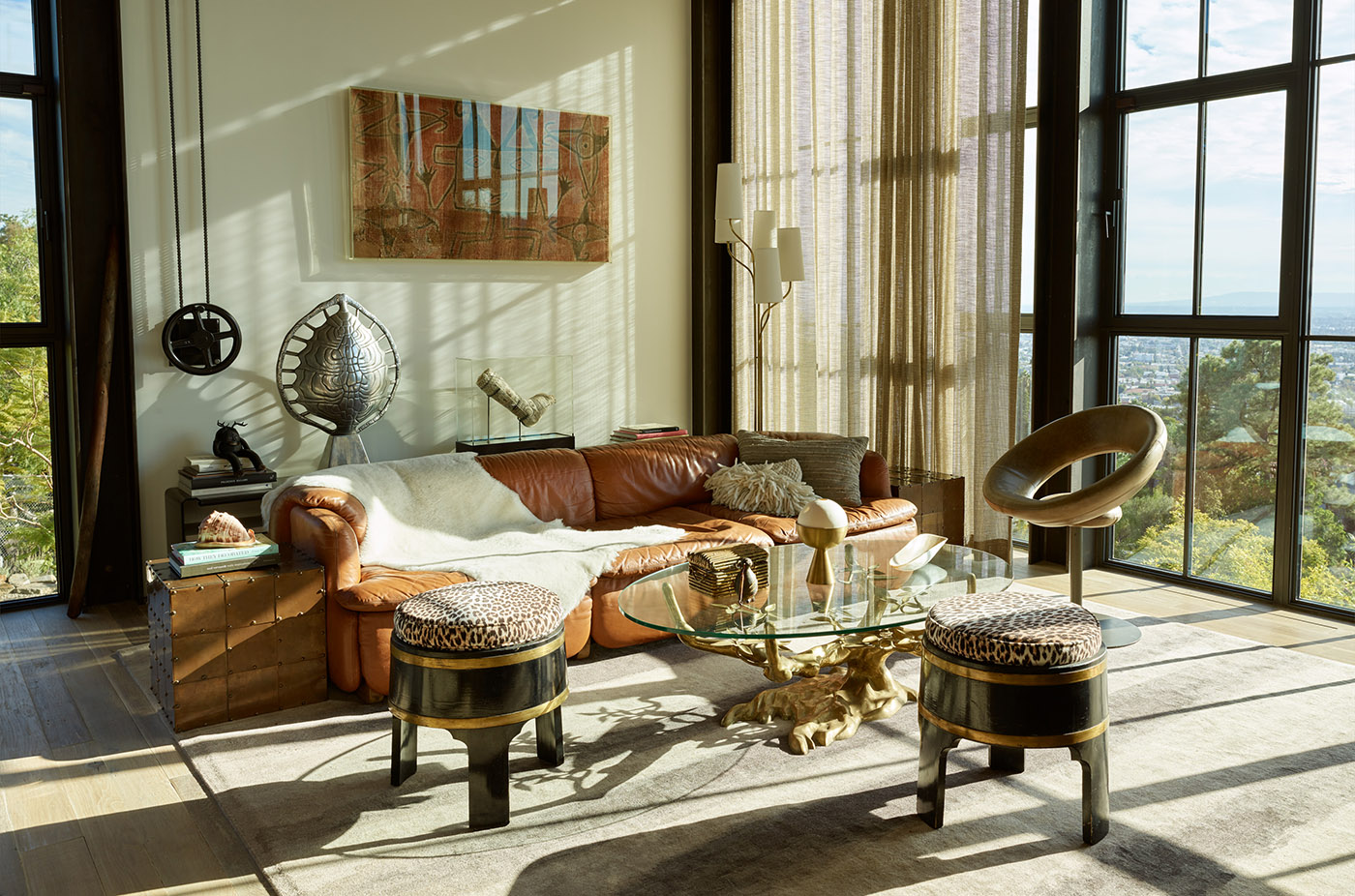 The living area is filled with eclectic artefacts including African masks, a willing Daro bronze table and a cast of a childhood bone fracture displayed like a relic. Light pours into the space through black steel Brombal windows. The farthest wall of the living area is all glass and faces south, offering a breathtaking view of Los Angeles