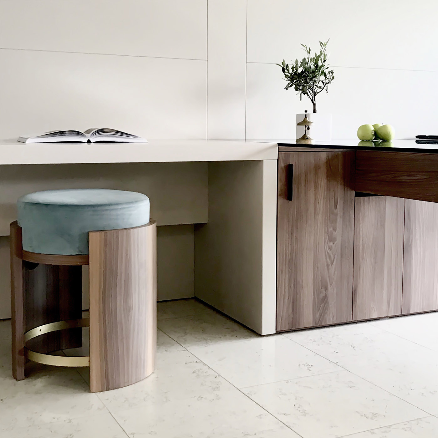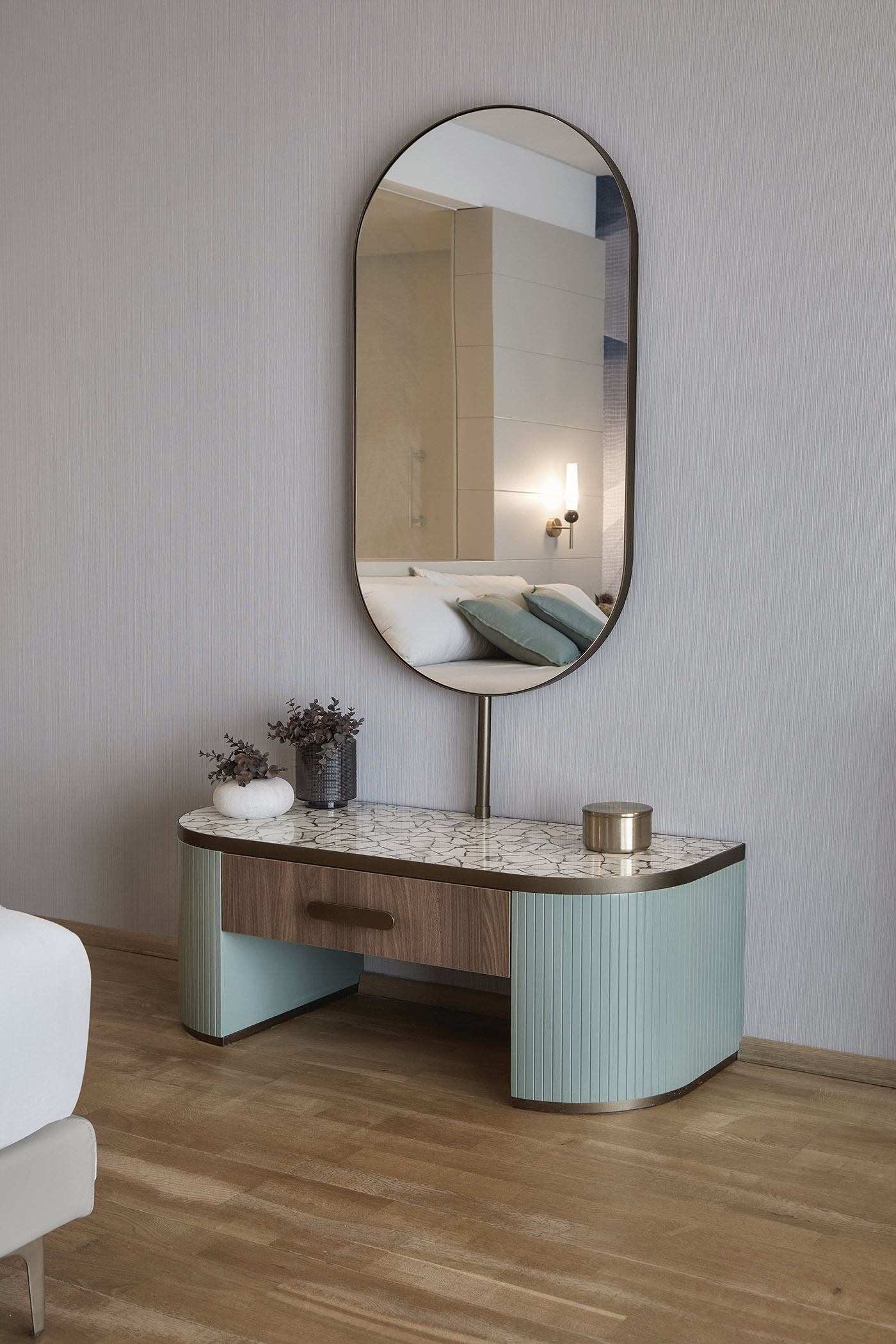 Each room and suite is distinguished by its accentuated identity, the result of ovre.design's creativity in creating authentic environments embellished with details. The spaces have been enhanced by careful design with custom-made furniture concepts, such as the bedside tables and headboards or the desk and luggage rack. Iconic is the elegant Smeg refrigerator with rounded shapes inserted in a spacious console with a circular mirror, named NANA. Also original was the choice to make the furniture functional and versatile, such as the small tables that can be used as poufs