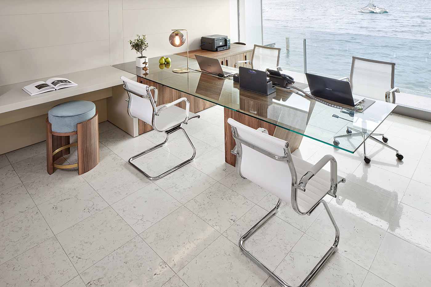 The choice of colors favored shades that catch the light and recall the natural colors of the place. The rooms were designed with the goal of defining a space in which the guest would be in close connection with the surrounding nature and its elements, from the lake water to the sky.