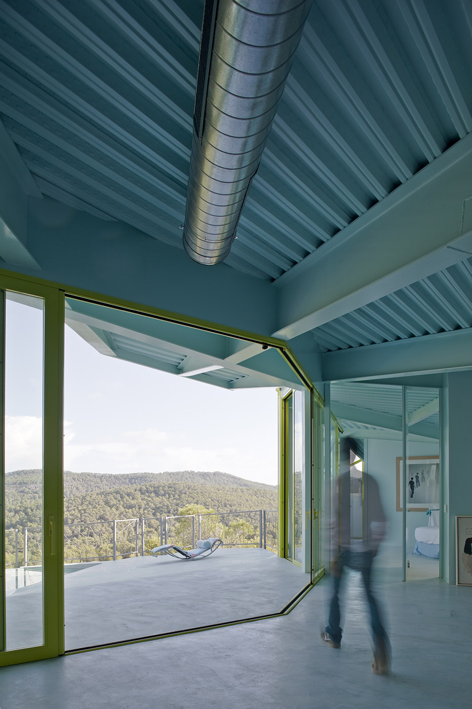 The configuration of the building means that the spacious living room can be expanded into a multifunctional outdoor ramp space that ends in a series of connecting pools. The bedrooms, located on either side of the living room avoid any hierarchy and are separated from the living room by folding walls