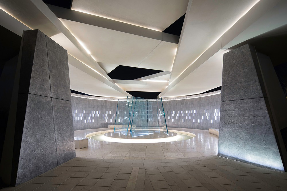 The Hall of Honor is a circular structure located at the end of the visitor's journey. It has seven glass panels in its center surrounded by a water feature, representing the seven Emirates of the UAE. The circular inner wall is lined with 2,800 sheets of aluminum made of recycled metal from the armored vehicles used in the service, which are inscribed with the names of the heroes of the UAE. The engineering company AECOM was responsible for the entire designing of The Memorial Park.