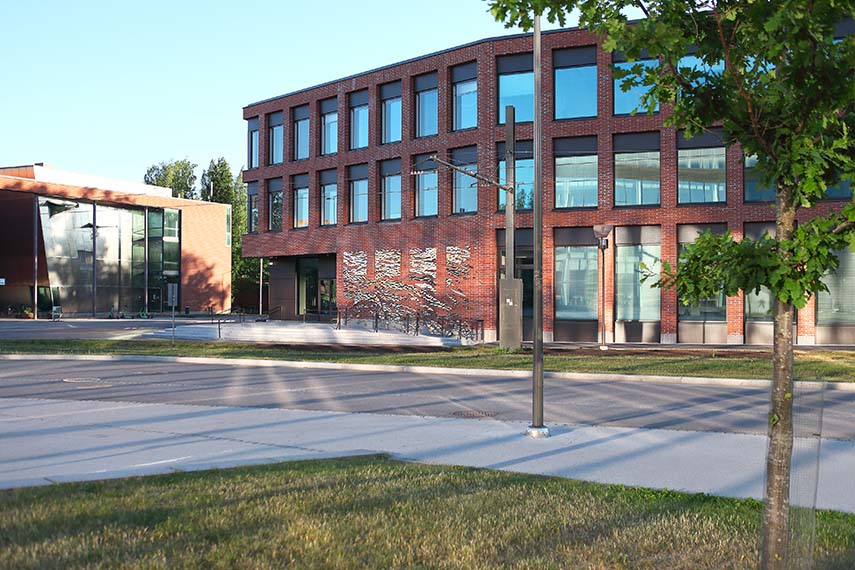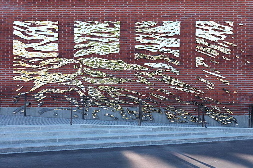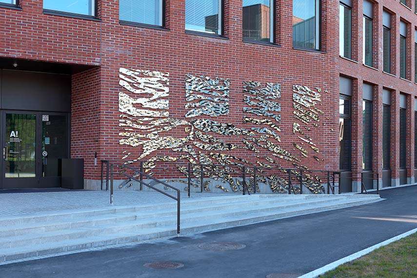 In motion is the title of the public work by Baptiste Debombourg, commissioned by Aalto University and curated by Outi Turpeinen for the new Kide Building designed by SARC+SIGGE Architects. The building, intended for the School of Basic Sciences and the School of Electrical Engineering, is located in the heart of the Otaniemi campus, in a strategic area between trams, pedestrians, and views of the iconic center designed by Alvar Aalto. It is this intersection that inspired the artist to explore the relationship between movement, urban landscape, and reflections of natural light.