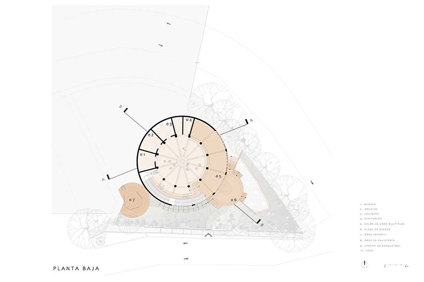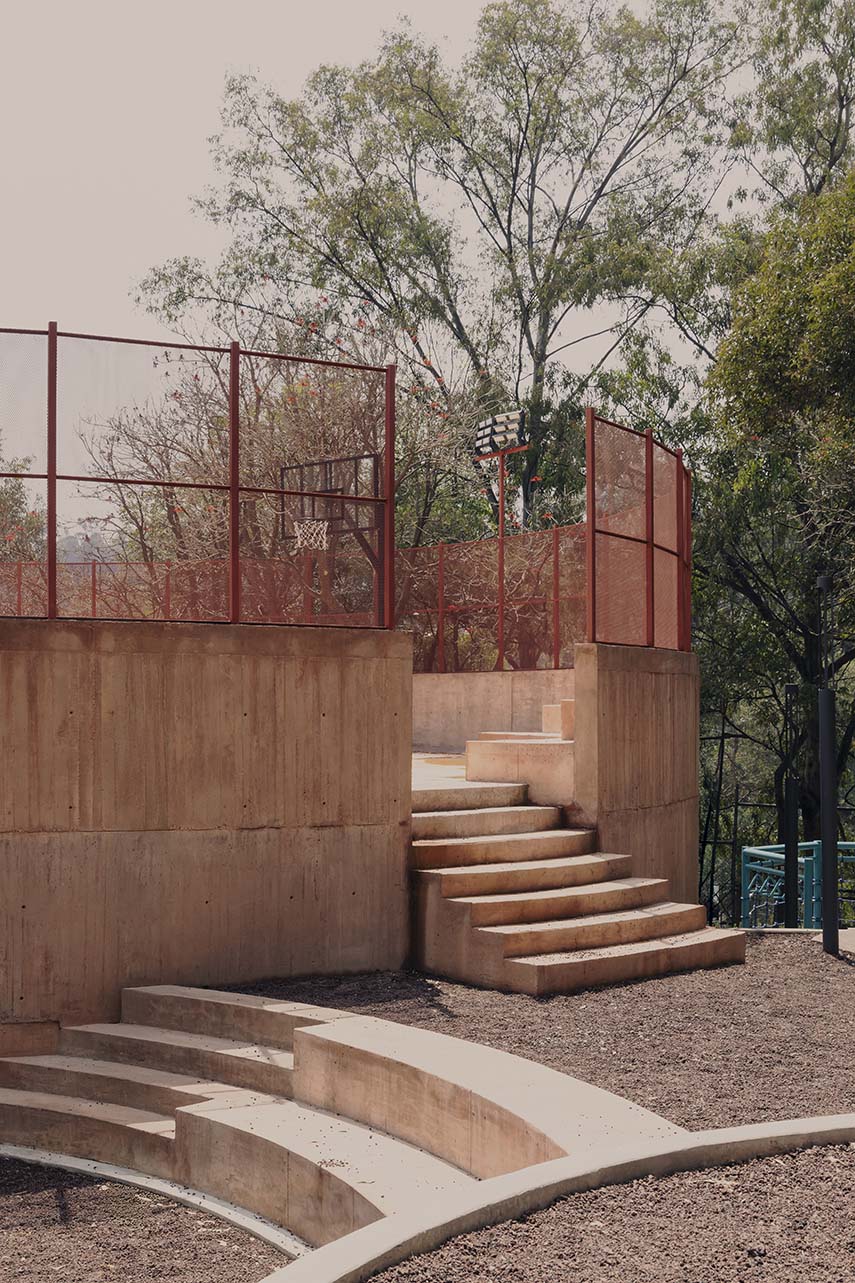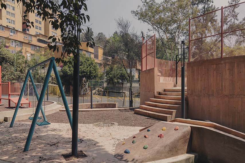 Located on the western edge of Mexico City, the residential complex UH INFONAVIT Santa Fe is situated on a ravine area characterized by steep slopes and significant level differences. In this challenging context, the intervention by AMASA Estudio faces one of the most complex sites developed in 2024. The existing buildings, constructed on a steep topography, made it difficult to connect between levels and provide accessibility to common spaces. The project area, located on the southern edge of the complex and at the intersection of two streets at different elevations, had a residual triangular shape and a long history of abandonment, with evident signs of physical decay and a widespread perception of insecurity, especially during nighttime.