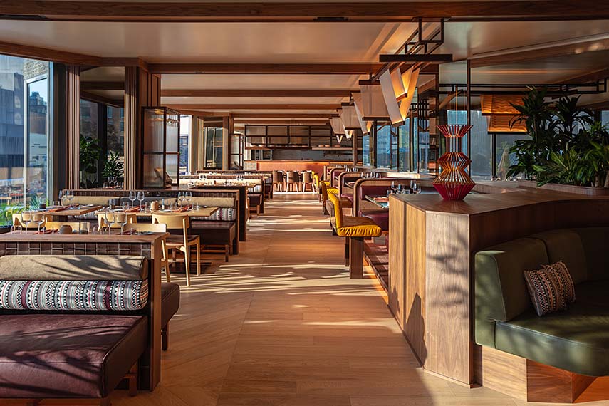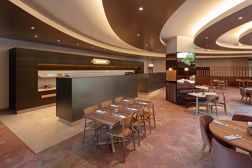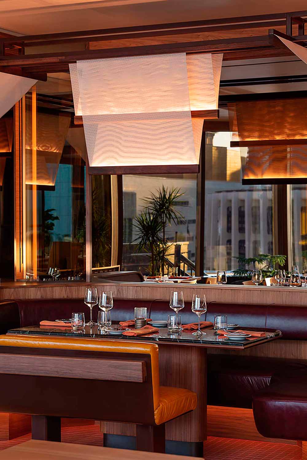 The restaurant features an open kitchen with two chef's tables, designed to integrate the F&B operations of the connected spaces. Premium materials such as marbles, velvets, and solid woods are combined with customized lighting to create a welcoming atmosphere both day and night. Large windows overlook the vibrant Quartier des Spectacles, offering breathtaking views of Place des Arts and the Museum of Contemporary Art.