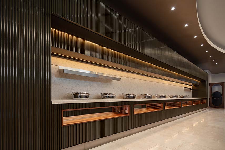 To facilitate the transition of the breakfast room into a multifunctional space, the breakfast service has been hidden between two monoliths, removing it as a central visual element. Next to the main room, a new VIP lounge offers light F&B services and comfort for premium guests. A glass wall allows the passage of natural light, ensuring privacy. Additionally, the adjacent outdoor terrace has been utilized to expand natural lighting and create a harmonious connection with hanging plants and the central tree.