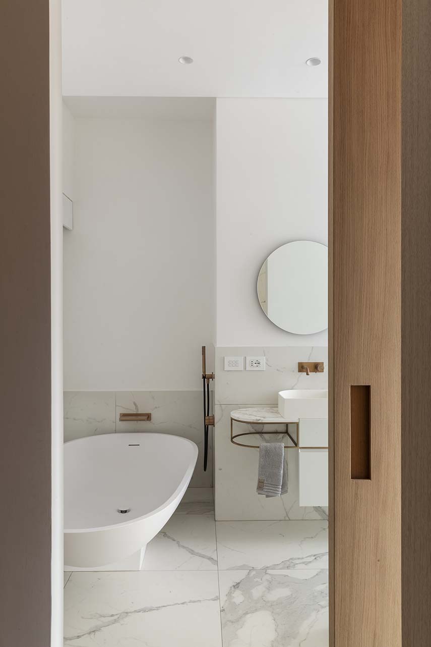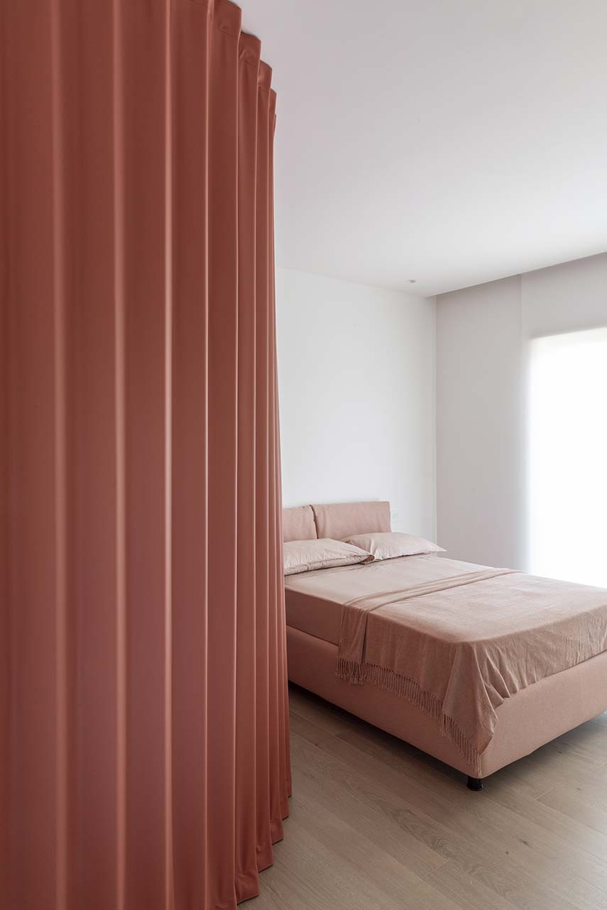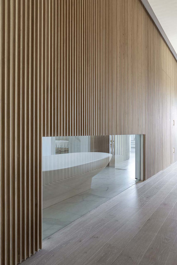 Architect Filippo Bombace's studio designs the interiors of Straight Curve House following the external layout and using it to define the internal partitions and all the furnishing elements. The atmosphere of the house is completed with the material and chromatic identification of the intervention based on the contrast between white walls and the widespread use of oak wood, with some inserts in calacatta marble