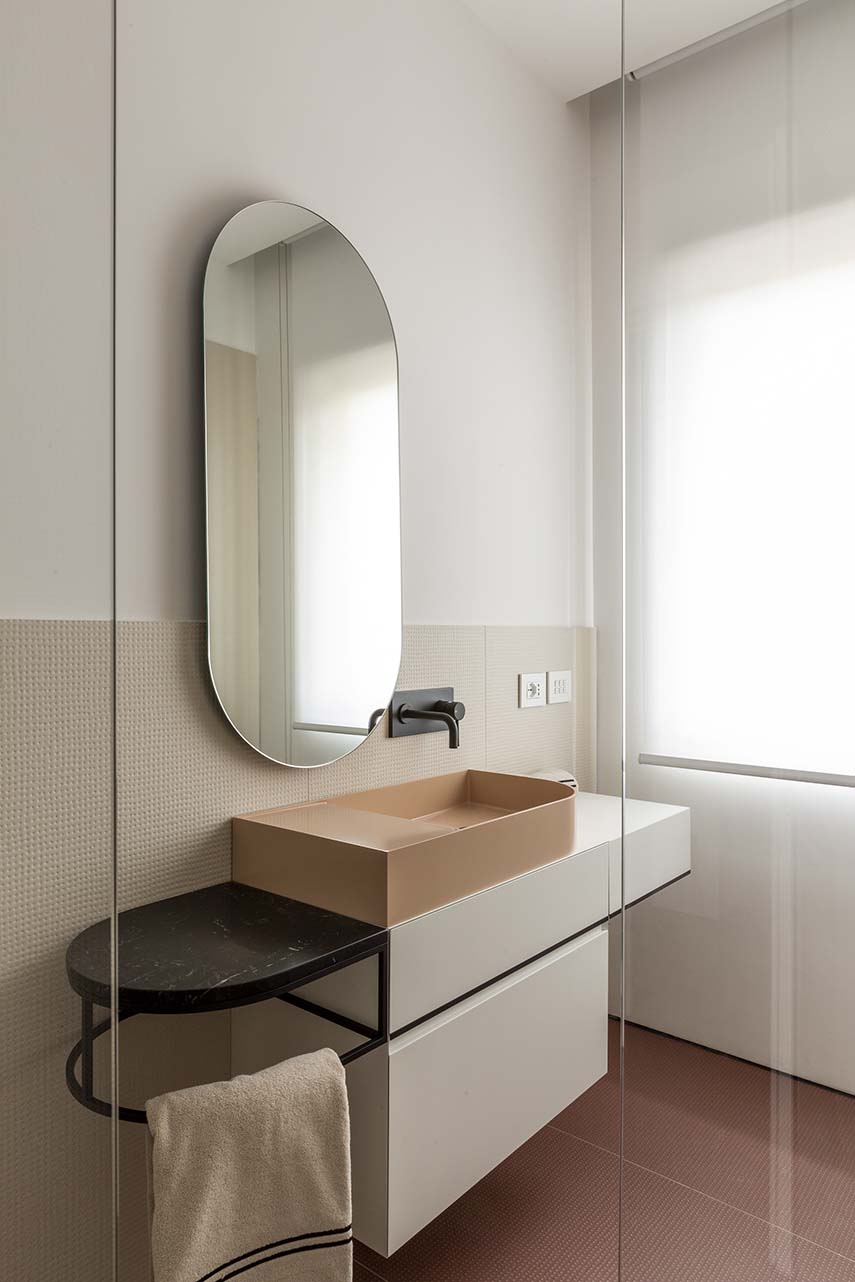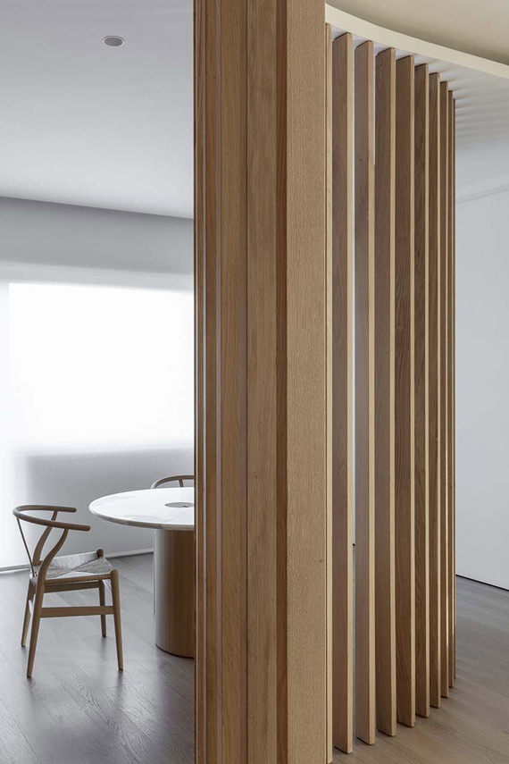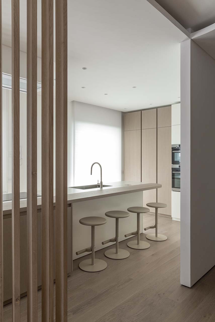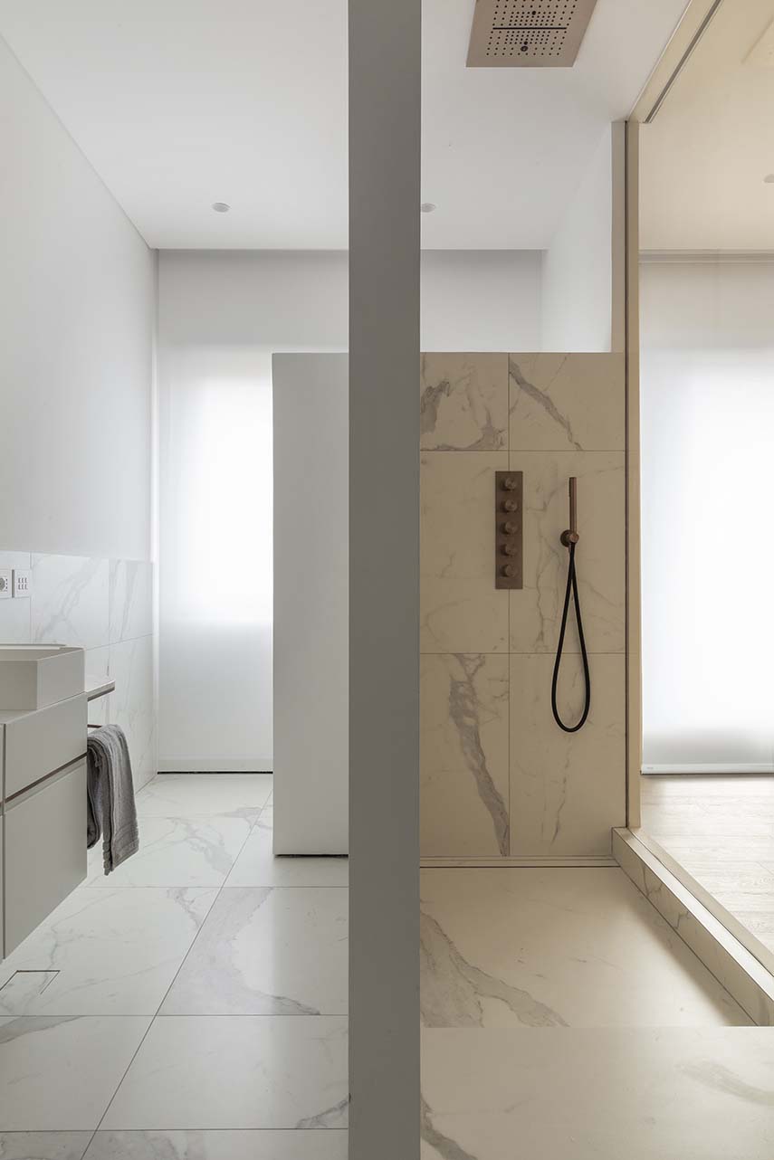 Architect Filippo Bombace's studio designs the interiors of Straight Curve House following the external layout and using it to define the internal partitions and all the furnishing elements. The atmosphere of the house is completed with the material and chromatic identification of the intervention based on the contrast between white walls and the widespread use of oak wood, with some inserts in calacatta marble